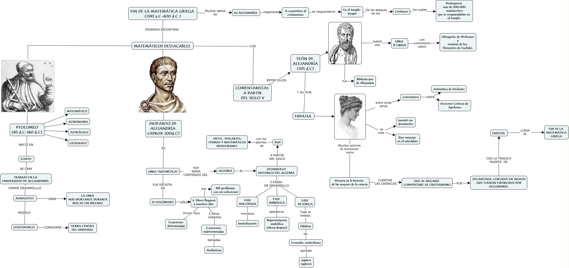 Este Cmap, tiene información relacionada con: 9.Fin de la matemática griega.Castronuovo Sabrina, DECAPITADA, CORTADA EN TROZOS QUE FUERON ESPARCIDOS POR ALEJANDRÍA CON LA TRAGICA MUERTE DE HIPATÍA, DESARROLLO HISTORICO DEL ALGEBRA 3 FASES DE DESARROLLO FASE SINCOPADA, PTOLOMEO (85 d.C-160 d.C) GEÓGRAFO, se cree hizo mejoras en el astrolabio, Cristianos los cuales Destruyeron mas de 300.000 manúscritos que se resguaradaban en el templo, ALGEBRA EL DESARROLLO HISTORICO DEL ALGEBRA, A convertirse al cristianismo se resguardaron En el templo Serapis, FIN DE LA MATEMÁTICA GRIEGA (200 a.C-400 d.C ) Muchos sabios de De ALEJANDRÍA, Ecuaciones indeterminadas llamadas Diofánticas, comentarios sobre Secciones Cónicas de Apolonio, se cree inventó un densímetro, comentarios sobre Aritmética de Diofanto, 6 libros llegaron a nuestros días son 189 problemas con sus soluciones, ???? fue Bibliotecario de Alejandría, HIPATIA, TRABAJÓ EN LA UNIVERSIDAD DE ALEJANDDRÍA DONDE DESARROLLLÓ ALMAGESTO, OBRA 11 LIBROS con comentario sobre Almagesto de Ptolomeo y revisión de los Elementos de Euclides, PTOLOMEO (85 d.C-160 d.C) ASTRÓNOMO, MATEMÁTICOS DESTACABLES PTOLOMEO (85 d.C-160 d.C), PTOLOMEO (85 d.C-160 d.C) NACIÓ EN EGIPTO