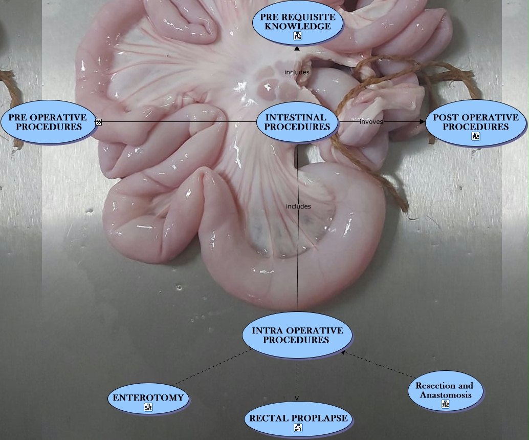 This Concept Map, created with IHMC CmapTools, has information related to: GROUP C LAB 8 - INTESTINAL SURGERIES, INTRA OPERATIVE PROCEDURES V RECTAL PROPLAPSE, Drugs For antibiotics - (MO) for Regional Anaesthesia, 5 station exam which can follow up with Fecal examination, INTRA OPERATIVE PROCEDURES ???? ENTEROTOMY, Drugs For antibiotics - (MO) for Local Anaesthesia, 5 station exam which can follow up with Culture and sensitivity, Restraint such as Chemical (MO), Distance and Physical Exam which can determine ASA Grade, 5 station exam which can follow up with Blood work, INTESTINAL PROCEDURES includes PRE REQUISITE KNOWLEDGE, PRE OPERATIVE PROCEDURES includes Drugs For antibiotics - (MO), PRE OPERATIVE PROCEDURES includes Distance and Physical Exam, INTESTINAL PROCEDURES invoves POST OPERATIVE PROCEDURES, INTESTINAL PROCEDURES includes INTRA OPERATIVE PROCEDURES, Distance and Physical Exam which can determine Diagnostic Imaging, PRE OPERATIVE PROCEDURES involves Signalment + History of Patient (MO), Distance and Physical Exam which can determine 5 station exam, INTESTINAL PROCEDURES involves PRE OPERATIVE PROCEDURES, Resection and Anastomosis INTRA OPERATIVE PROCEDURES, PRE OPERATIVE PROCEDURES includes Restraint