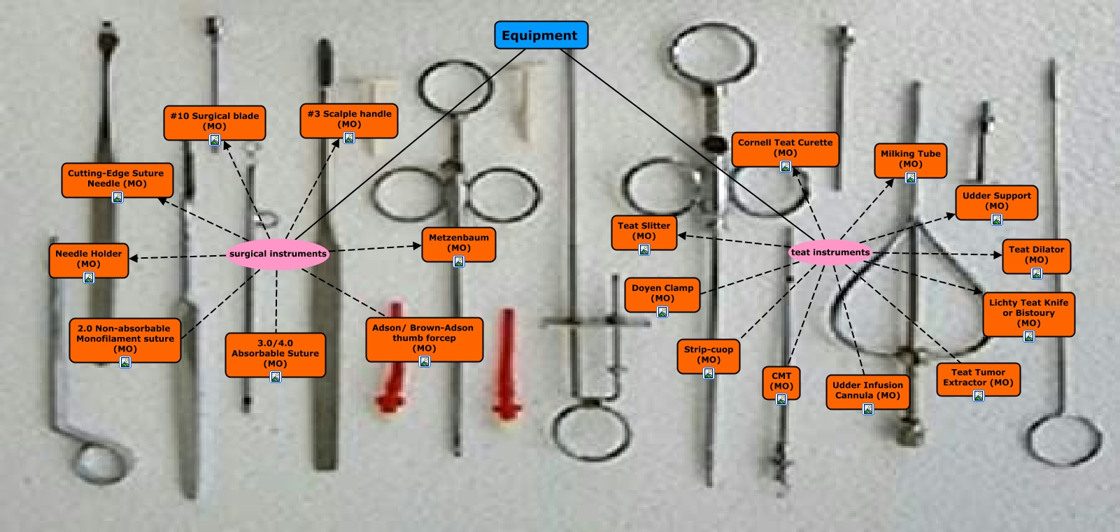 This Concept Map, created with IHMC CmapTools, has information related to: Equipment, Equipment teat instruments Lichty Teat Knife or Bistoury (MO), Equipment teat instruments CMT (MO), Equipment surgical instruments Adson/ Brown-Adson thumb forcep (MO), Equipment teat instruments Teat Slitter (MO), Equipment surgical instruments Cutting-Edge Suture Needle (MO), Equipment surgical instruments Metzenbaum (MO), Equipment teat instruments Strip-cuop (MO), Equipment teat instruments Milking Tube (MO), Equipment teat instruments Udder Support (MO), Equipment teat instruments Teat Dilator (MO), Equipment surgical instruments #3 Scalple handle (MO), Equipment surgical instruments 2.0 Non-absorbable Monofilament suture (MO), Equipment surgical instruments 3.0/4.0 Absorbable Suture (MO), Equipment surgical instruments Needle Holder (MO), Equipment teat instruments Cornell Teat Curette (MO), Equipment teat instruments Doyen Clamp (MO), Equipment teat instruments Udder Infusion Cannula (MO), Equipment teat instruments Teat Tumor Extractor (MO), Equipment surgical instruments #10 Surgical blade (MO)