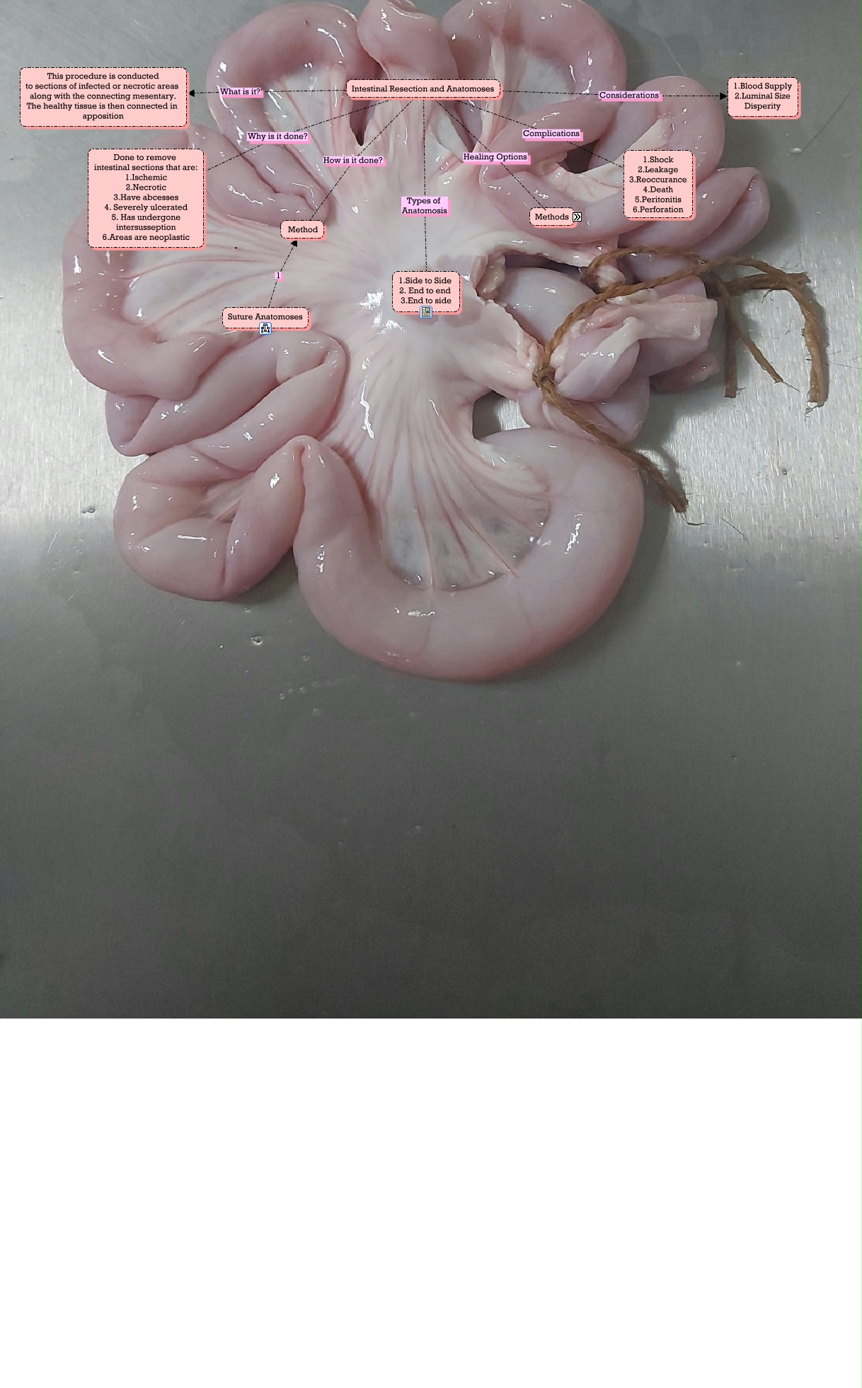 This Concept Map, created with IHMC CmapTools, has information related to: Intestinal Resection and Anatomoses, Methods of to Promote Healing 3 Bowel Plication, Methods of to Promote Healing 2 Omental Patching, Intestinal Resection and Anatomoses What is it? This procedure is conducted to sections of infected or necrotic areas along with the connecting mesentary. The healthy tissue is then connected in apposition, Intestinal Resection and Anatomoses Why is it done? Done to remove intestinal sections that are: 1.Ischemic 2.Necrotic 3.Have abcesses 4. Severely ulcerated 5. Has undergone intersusseption 6.Areas are neoplastic, Intestinal Resection and Anatomoses Considerations 1.Blood Supply 2.Luminal Size Disperity, Methods of to Promote Healing 1 Serosal Patching, Intestinal Resection and Anatomoses Complications 1.Shock 2.Leakage 3.Reoccurance 4.Death 5.Peritonitis 6.Perforation, Intestinal Resection and Anatomoses How is it done? Method, Intestinal Resection and Anatomoses Healing Options Methods of to Promote Healing, Suture Anatomoses 1 Method, Intestinal Resection and Anatomoses Types of Anatomosis 1.Side to Side 2. End to end 3.End to side