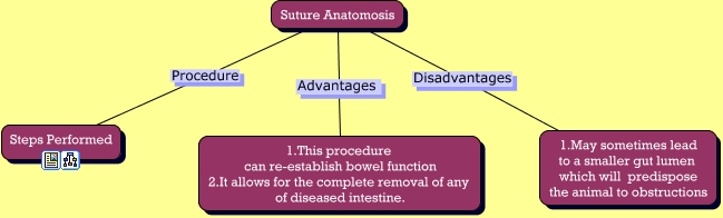 This Concept Map, created with IHMC CmapTools, has information related to: Suture Anatomosis, Suture Anatomosis Disadvantages 1.May sometimes lead to a smaller gut lumen which will predispose the animal to obstructions, Suture Anatomosis Advantages 1.This procedure can re-establish bowel function 2.It allows for the complete removal of any of diseased intestine., Suture Anatomosis Procedure Steps Performed