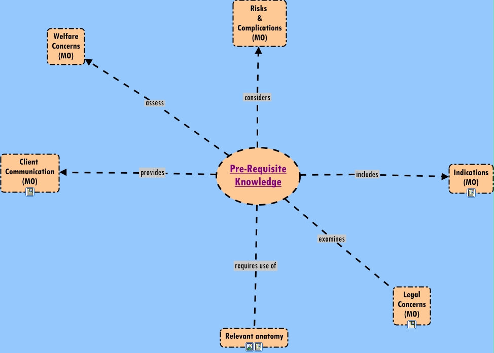 This Concept Map, created with IHMC CmapTools, has information related to: Pre-Requisite Knowledge, Pre-Requisite Knowledge provides Client Communication (MO), Pre-Requisite Knowledge assess Welfare Concerns (MO), Pre-Requisite Knowledge considers Risks & Complications (MO), Pre-Requisite Knowledge requires use of Relevant anatomy, Pre-Requisite Knowledge includes Indications (MO), Pre-Requisite Knowledge examines Legal Concerns (MO)
