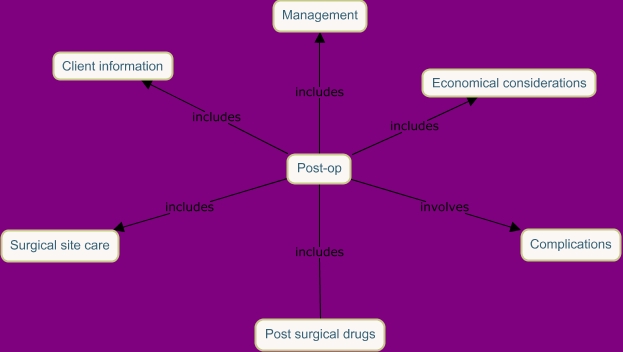This Concept Map, created with IHMC CmapTools, has information related to: POST-OP, Post-op includes Economical considerations, Post-op includes Management, Post-op involves Complications, Post-op includes Surgical site care, Post-op includes Client information, Post-op includes Post surgical drugs