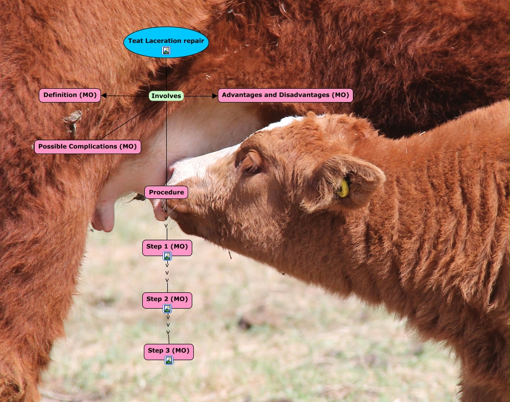 This Concept Map, created with IHMC CmapTools, has information related to: Teat Laceration Repair, Teat Laceration repair Involves Possible Complications (MO), Procedure v v v Step 1 (MO), Teat Laceration repair Involves Advantages and Disadvantages (MO), Teat Laceration repair Involves Definition (MO), Teat Laceration repair Involves Procedure, Step 2 (MO) v v v Step 3 (MO), Step 1 (MO) v v v Step 2 (MO)