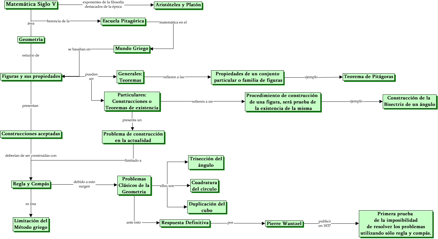Este Cmap, tiene información relacionada con: Matemática del siglo V, Figuras y sus propiedades pueden ser Particulares: Construcciones o Teoremas de existencia, Regla y Compás es una Limitación del Método griego, Problema de construcción en la actualidad limitado a Regla y Compás, Respuesta Definitiva por Pierre Wantzel, Problemas Clásicos de la Geometria ellos son Duplicación del cubo, Matemática Siglo V área Geometría, Problemas Clásicos de la Geometria ellos son Cuadratura del círculo, Propiedades de un conjunto particular o familia de figuras ejemplo Teorema de Pitágoras, Particulares: Construcciones o Teoremas de existencia presenta un Problema de construcción en la actualidad, Problemas Clásicos de la Geometria ellos son Trisección del ángulo, Matemática Siglo V herencia de la Escuela Pitagórica, Construcciones aceptadas deberían de ser construidas con Regla y Compás, Procedimiento de construcción de una figura, será prueba de la existencia de la misma ejemplo Construcción de la Bisectriz de un ángulo, Geometría estudio de Figuras y sus propiedades, Matemática Siglo V exponentes de la filosofía destacados de la época Aristóteles y Platón, Generales: Teoremas refieren a las Propiedades de un conjunto particular o familia de figuras, Problemas Clásicos de la Geometria ante esto Respuesta Definitiva, Particulares: Construcciones o Teoremas de existencia refieren a un Procedimiento de construcción de una figura, será prueba de la existencia de la misma, Figuras y sus propiedades pueden ser Generales: Teoremas, Figuras y sus propiedades presentan Construcciones aceptadas