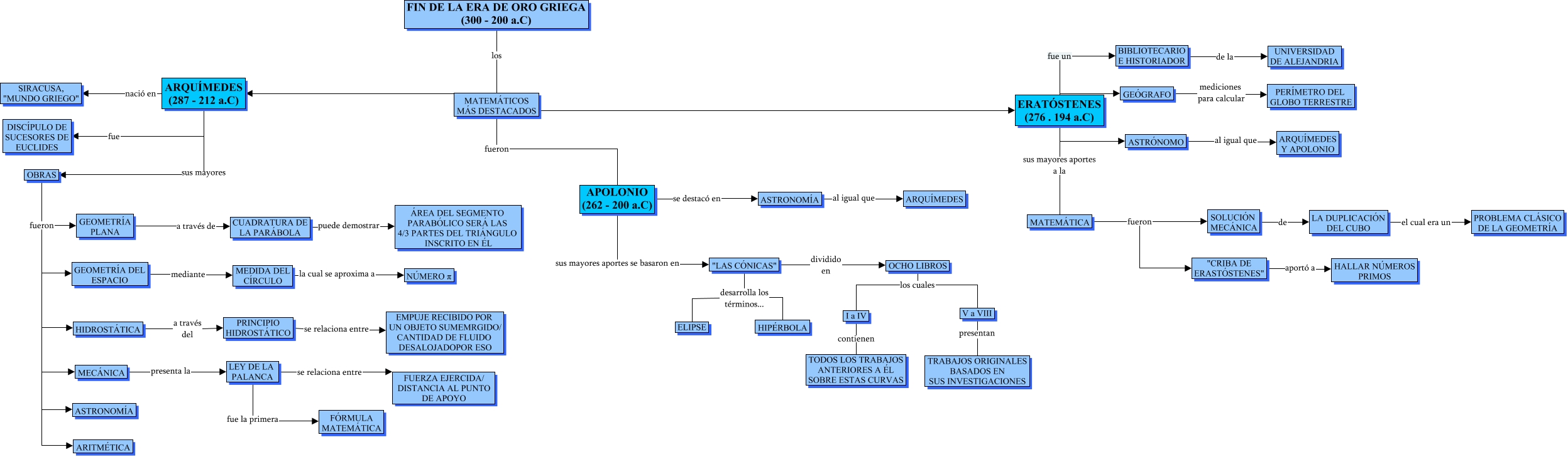Este Cmap, tiene información relacionada con: Fin de la era de oro griega, OBRAS fueron ARITMÉTICA, MATEMÁTICOS MÁS DESTACADOS fueron ARQUÍMEDES (287 - 212 a.C), ERATÓSTENES (276 . 194 a.C) fue un GEÓGRAFO, FIN DE LA ERA DE ORO GRIEGA (300 - 200 a.C) los MATEMÁTICOS MÁS DESTACADOS, MATEMÁTICA fueron SOLUCIÓN MECÁNICA, OBRAS fueron HIDROSTÁTICA, HIDROSTÁTICA a través del PRINCIPIO HIDROSTÁTICO, GEÓGRAFO mediciones para calcular PERÍMETRO DEL GLOBO TERRESTRE, OBRAS fueron MECÁNICA, ERATÓSTENES (276 . 194 a.C) fue un BIBLIOTECARIO E HISTORIADOR, OBRAS fueron GEOMETRÍA DEL ESPACIO, ARQUÍMEDES (287 - 212 a.C) fue DISCÍPULO DE SUCESORES DE EUCLIDES, "LAS CÓNICAS" desarrolla los términos... ELIPSE, CUADRATURA DE LA PARÁBOLA puede demostrar ÁREA DEL SEGMENTO PARABÓLICO SERÁ LAS 4/3 PARTES DEL TRIÁNGULO INSCRITO EN ÉL, "LAS CÓNICAS" desarrolla los términos... HIPÉRBOLA, OCHO LIBROS los cuales I a IV, MATEMÁTICOS MÁS DESTACADOS fueron APOLONIO (262 - 200 a.C), ERATÓSTENES (276 . 194 a.C) sus mayores aportes a la MATEMÁTICA, OCHO LIBROS los cuales V a VIII, MECÁNICA presenta la LEY DE LA PALANCA