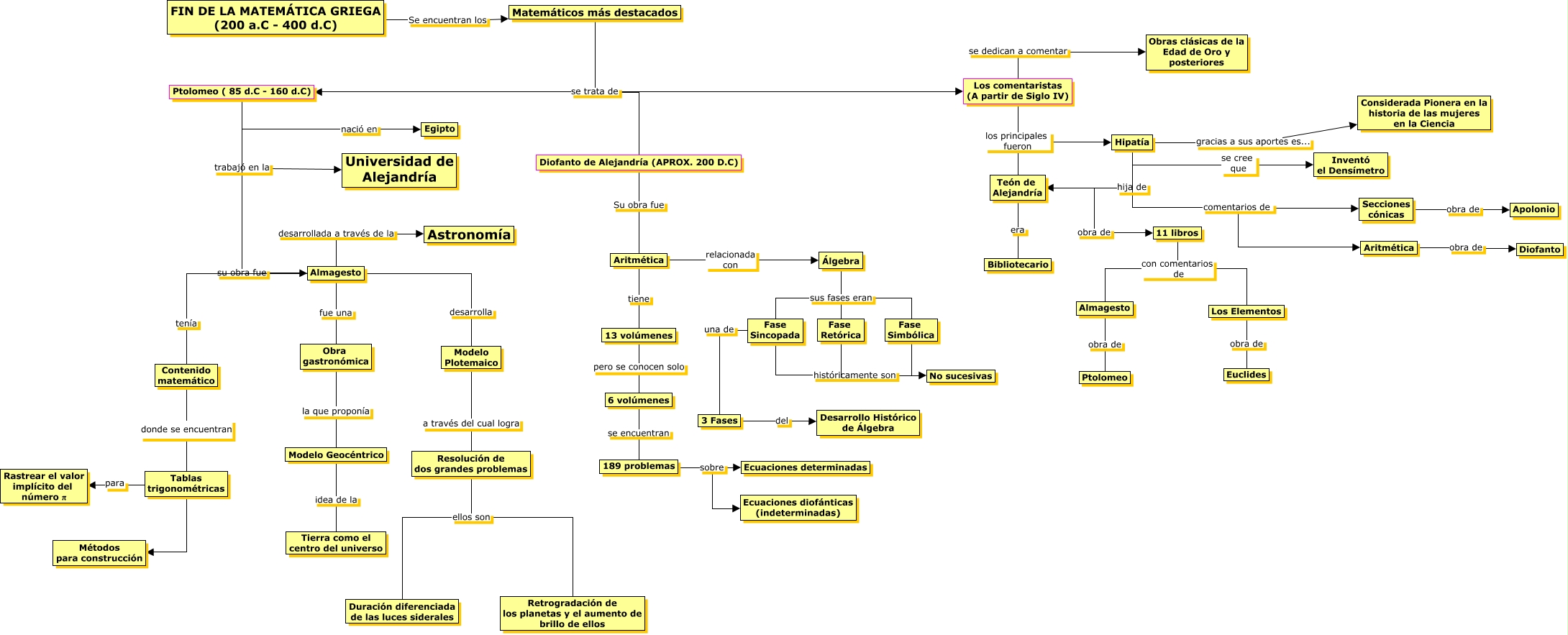 Este Cmap, tiene información relacionada con: 8-FIN DE LA MATEMATICA GRIEGA, Hipatía hija de Teón de Alejandría, Almagesto tenía Contenido matemático, Los comentaristas (A partir de Siglo IV) los principales fueron Hipatía, Resolución de dos grandes problemas ellos son Duración diferenciada de las luces siderales, Modelo Geocéntrico idea de la Tierra como el centro del universo, Contenido matemático donde se encuentran Métodos para construcción, Álgebra sus fases eran Fase Retórica, Hipatía comentarios de Secciones cónicas, Fase Sincopada una de 3 Fases, 11 libros con comentarios de Los Elementos, Almagesto obra de Ptolomeo, Aritmética tiene 13 volúmenes, Obra gastronómica la que proponía Modelo Geocéntrico, Ptolomeo ( 85 d.C - 160 d.C) su obra fue Almagesto, Diofanto de Alejandría (APROX. 200 D.C) Su obra fue Aritmética, Secciones cónicas obra de Apolonio, Fase Retórica históricamente son No sucesivas, 3 Fases del Desarrollo Histórico de Álgebra, Álgebra sus fases eran Fase Simbólica, Resolución de dos grandes problemas ellos son Retrogradación de los planetas y el aumento de brillo de ellos