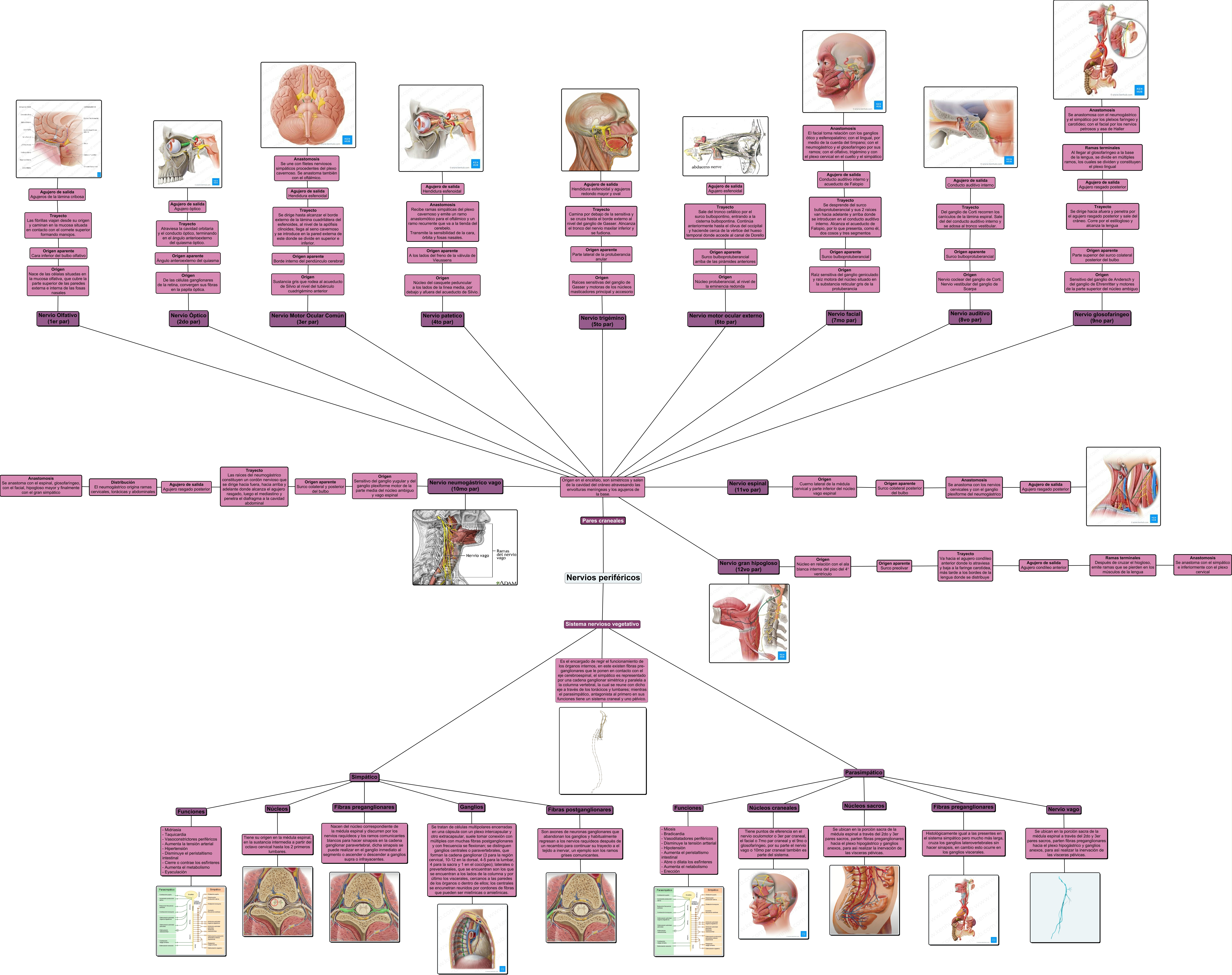 Este Cmap, tiene información relacionada con: Sistema nervioso periférico, Origen Nervio coclear del ganglio de Corti. Nervio vestibular del ganglio de Scarpa Origen aparente Surco bulboprotuberancial, Sistema nervioso vegetativo Es el encargado de regir el funcionamiento de los órganos internos, en este existen fibras pre- ganglionares que le ponen en contacto con el eje cerebroespinal, el simpático es representado por una cadena ganglionar simétrica y paralela a la columna vertebral, la cual se reune con dicho eje a través de los torácicos y lumbares; mientras el parasimpático, antagonista al primero en sus funciones tiene un sistema craneal y uno pélvico., Origen Raíz sensitiva del ganglio geniculado y raíz motora del núcleo situado en la substancia reticular gris de la protuberancia Origen aparente Surco bulboprotuberancial, Nervio glosofaríngeo (9no par) Origen Sensitivo del ganglio de Andersch y del ganglio de Ehrenritter y motores de la parte superior del núcleo ambiguo, Trayecto Las fibrillas viajan desde su origen y caminan en la mucosa situada en contacto con el cornete superior formando manojos. Agujero de salida Agujeros de la lámina cribosa, Anastomosis Recibe ramas simpáticas del plexo cavernoso y emite un ramo anastomótico para el oftálmico y un ramo recurrente que va a la tienda del cerebelo. Transmite la sensibilidad de la cara, órbita y fosas nasales. Agujero de salida Hendidura esfenoidal, Origen en el encéfalo, son simétricos y salen de la cavidad del cráneo atravesando las envolturas meníngeas y los agujeros de la base. Nervio glosofaríngeo (9no par), Nervio trigémino (5to par) Origen Raíces sensitivas del ganglio de Gasser y motoras de los núcleos masticadores principal y accesorio, Nervio vago, Nervio auditivo (8vo par) Origen Nervio coclear del ganglio de Corti. Nervio vestibular del ganglio de Scarpa, Simpático Núcleos, Origen Nace de las célalas situadas en la mucosa olfativa, que cubre la parte superior de las paredes externa e interna de las fosas nasales Origen aparente Cara inferior del bulbo olfativo, Parasimpático Fibras preganglionares, Ramas terminales Al llegar al glosofaríngeo a la base de la lengua, se divide en múltiples ramos, los cuales se dividen y constituyen el plexo lingual Anastomosis Se anastomosa con el neumogástrico y el simpático por los plelxos faríngeo y carotídeo; con el facial por los nervios petrosos y asa de Haller, Origen aparente Ángulo anteroexterno del quiasma Trayecto Atraviesa la cavidad orbitaria y el conducto óptico, terminando en el ángulo anterioexterno del quiasma óptico., Origen en el encéfalo, son simétricos y salen de la cavidad del cráneo atravesando las envolturas meníngeas y los agujeros de la base. Nervio espinal (11vo par), Anastomosis Se anastomosa con el neumogástrico y el simpático por los plelxos faríngeo y carotídeo; con el facial por los nervios petrosos y asa de Haller, Núcleos craneales, Trayecto Atraviesa la cavidad orbitaria y el conducto óptico, terminando en el ángulo anterioexterno del quiasma óptico. Agujero de salida Agujero óptico, Origen Sustancia gris que rodea al acueducto de Silvio al nivel del tubérculo cuadrigémino anterior Origen aparente Borde interno del pendúnculo cerebral