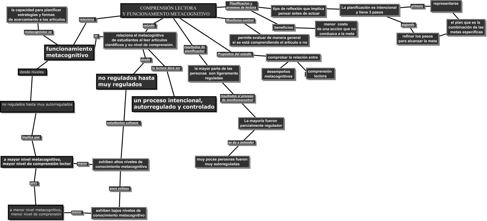 Este Cmap, tiene información relacionada con: trabajo de lectura, funcionamiento metacognitivo metacognicion es la capacidad para planificar estrategias y formas de acercamiento a los artículos, no regulados hasta muy regulados estudiantes exitosos exhiben altos niveles de conocimiento metacognitivo, a mayor nivel metacognitivo, mayor nivel de comprensión lector pero a menor nivel metacognitivo, menor nivel de comprensión, a mayor nivel metacognitivo, mayor nivel de comprensión lector mayor exhiben altos niveles de conocimiento metacognitivo, representarse ???? el plan que es la combinación de las metas específicas, COMPRENSIÓN LECTORA Y FUNCIONAMIENTO METACOGNITIVO Planificacion y prosesos de lectura tipo de reflexión que implica pensar antes de actuar, tipo de reflexión que implica pensar antes de actuar ???? La planificación es intencional y tiene 3 pasos, La mayoria fueron parcialmente regulador se da a entender muy pocas perosnas fueron muy autoreguladas, COMPRENSIÓN LECTORA Y FUNCIONAMIENTO METACOGNITIVO relaciona funcionamiento metacognitivo, comprobar la relación entre ???? comprensión lectora, desde niveles ???? no regulados hasta muy autorregulados, a menor nivel metacognitivo, menor nivel de comprensión menor exhiben bajos niveles de conocimiento metacognitivo, COMPRENSIÓN LECTORA Y FUNCIONAMIENTO METACOGNITIVO resultados de planificacion la mayor parte de las personas son ligeramente reguladas, COMPRENSIÓN LECTORA Y FUNCIONAMIENTO METACOGNITIVO estudio relaciona el metacognitiva de estudiantes al leer artículos científicos y su nivel de comprensión., relaciona el metacognitiva de estudiantes al leer artículos científicos y su nivel de comprensión. es funcionamiento metacognitivo, comprobar la relación entre ???? desempeños metacognitivos, La planificación es intencional y tiene 3 pasos primero representarse, beneficios ???? menor costo de una acción que no conduzca a la meta, la mayor parte de las personas son ligeramente reguladas resultados el proceso de monitoreocontrol La mayoria fueron parcialmente regulador, COMPRENSIÓN LECTORA Y FUNCIONAMIENTO METACOGNITIVO Planificacion y prosesos de lectura beneficios