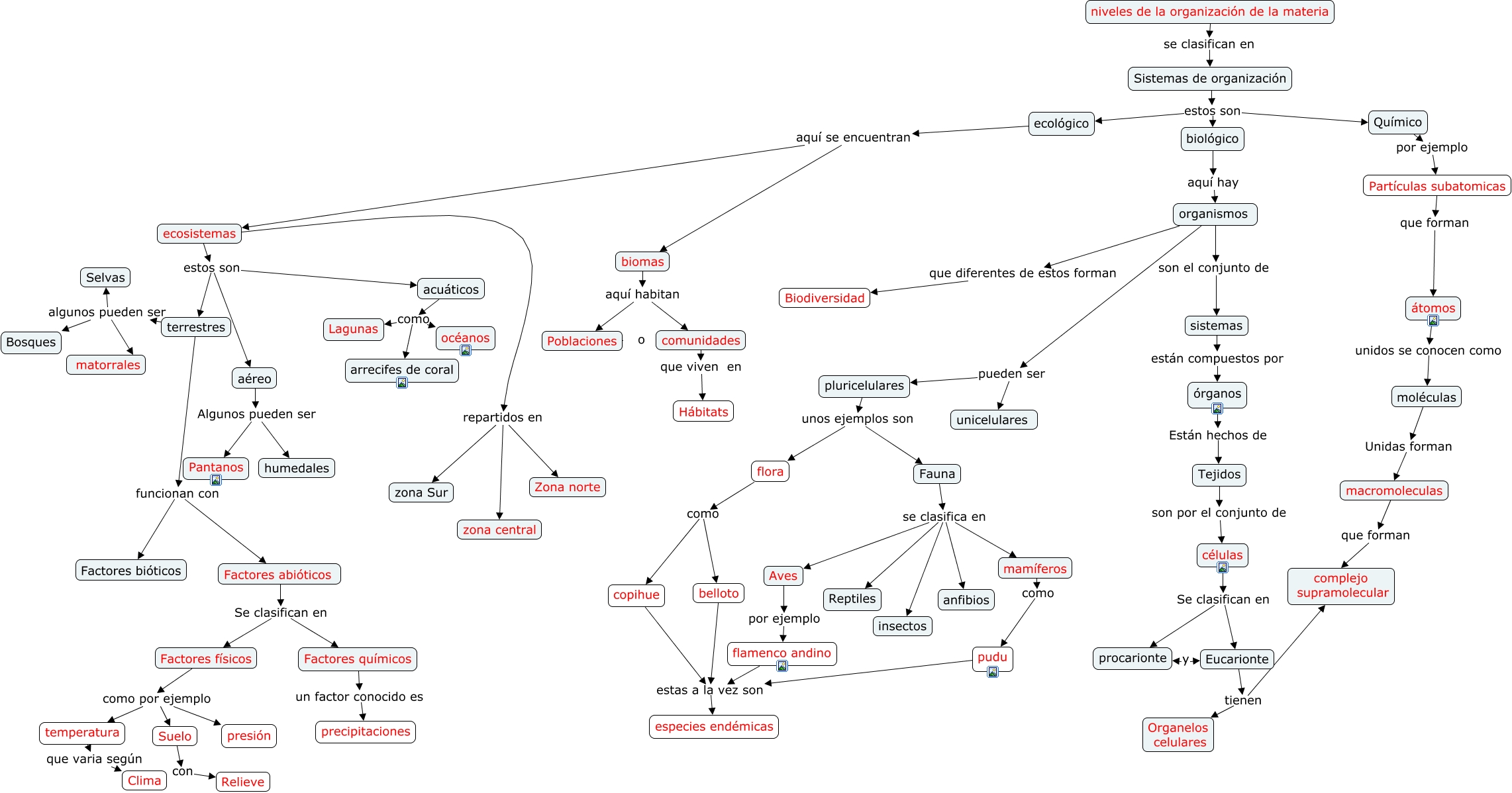 This Concept Map, created with IHMC CmapTools, has information related to: biologia 2 Sk. 1°B, terrestres algunos pueden ser Bosques, ecológico aquí se encuentran ecosistemas, Partículas subatomicas que forman átomos, terrestres funcionan con Factores abióticos, Sistemas de organización estos son ecológico, células Se clasifican en procarionte, Eucarionte tienen complejo supramolecular, terrestres algunos pueden ser matorrales, Poblaciones o comunidades, terrestres algunos pueden ser Selvas, macromoleculas que forman complejo supramolecular, ecosistemas repartidos en zona central, comunidades que viven en Hábitats, flora como belloto, ecológico aquí se encuentran biomas, Fauna se clasifica en anfibios, Aves por ejemplo flamenco andino, Factores físicos como por ejemplo presión, acuáticos como océanos, ecosistemas repartidos en Zona norte
