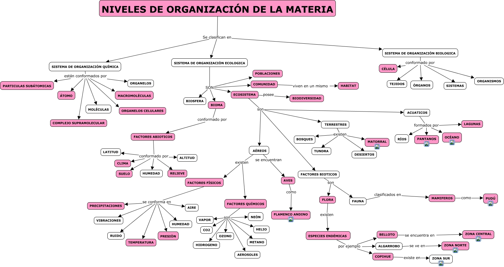 Este Cmap, tiene información relacionada con: niveles de organización de la materia MATILDE GODOY IB, TERRESTRES existen DESIERTOS, AÉREOS existen FACTORES QUÍMICOS, SISTEMA DE ORGANIZACIÓN QUÍMICA están conformados por ÁTOMO, FLORA existen ESPECIES ENDÉMICAS, FACTORES BIOTICOS son FAUNA, ACUATICOS formados por LAGUNAS, NIVELES DE ORGANIZACIÓN DE LA MATERIA Se clasifican en SISTEMA DE ORGANIZACIÓN BIOLOGICA, FACTORES QUÍMICOS son VAPOR, AVES como FLAMENCO ANDINO, SISTEMA DE ORGANIZACIÓN QUÍMICA están conformados por MOLÉCULAS, ECOSISTEMA son AÉREOS, SISTEMA DE ORGANIZACIÓN QUÍMICA están conformados por COMPLEJO SUPRAMOLECULAR, ECOSISTEMA son ACUATICOS, FACTORES QUÍMICOS son OZONO, FACTORES QUÍMICOS son AEROSOLES, ECOSISTEMA posee BIODIVERSIDAD, NIVELES DE ORGANIZACIÓN DE LA MATERIA Se clasifican en SISTEMA DE ORGANIZACIÓN ECOLOGICA, SISTEMA DE ORGANIZACIÓN BIOLOGICA conformado por CÉLULA, TERRESTRES existen MATORRAL, COMUNIDAD viven en un mismo HABITAT