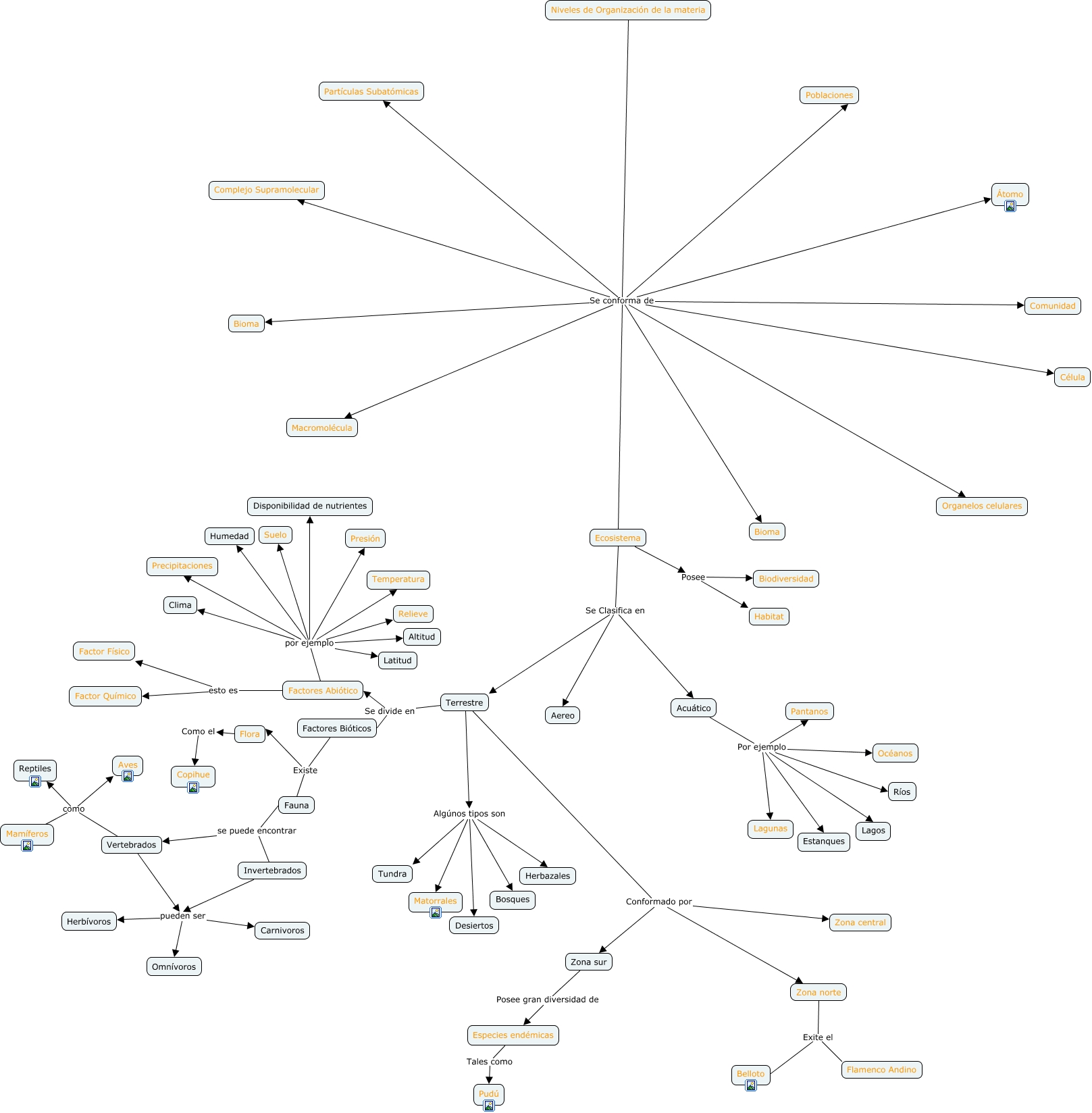 Este Cmap, tiene información relacionada con: niveles de organización de la materia, Vertebrados como Reptiles, Acuático Por ejemplo Estanques, Factores Abiótico por ejemplo Clima, Niveles de Organización de la materia Se conforma de Célula, Acuático Por ejemplo Pantanos, Acuático Por ejemplo Lagos, Fauna se puede encontrar Vertebrados, Factores Bióticos Existe Flora, Terrestre Algúnos tipos son Desiertos, Niveles de Organización de la materia Se conforma de Macromolécula, Niveles de Organización de la materia Se conforma de Ecosistema, Especies endémicas Tales como Pudú, Factores Abiótico por ejemplo Humedad, Niveles de Organización de la materia Se conforma de Organelos celulares, Invertebrados pueden ser Carnivoros, Factores Abiótico por ejemplo Suelo, Invertebrados pueden ser Omnívoros, Niveles de Organización de la materia Se conforma de Complejo Supramolecular, Zona sur Posee gran diversidad de Especies endémicas, Acuático Por ejemplo Lagunas