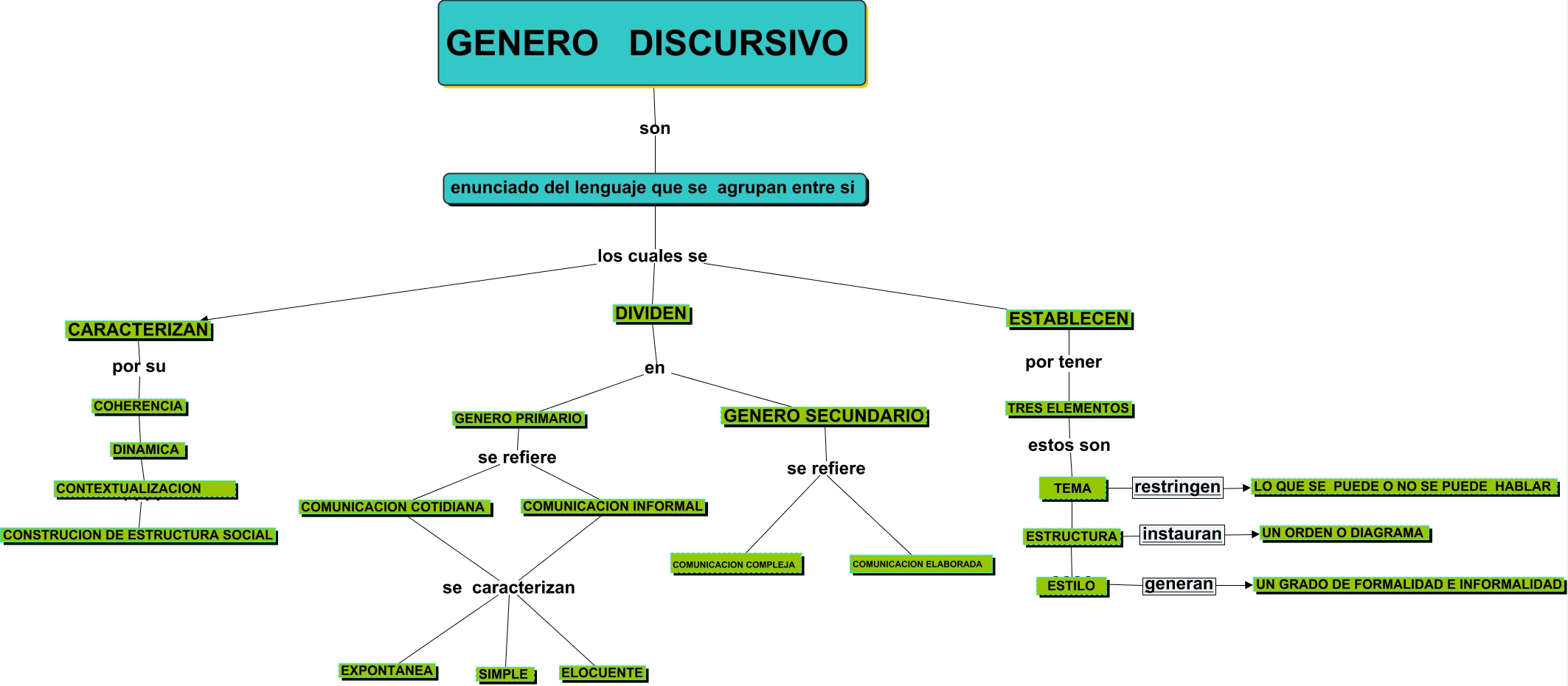 Este Cmap, tiene información relacionada con: dana mapa conceptual, restringen ???? TEMA, instauran ???? ESTRUCTURA, CARACTERIZAN por su COHERENCIA, enunciado del lenguaje que se agrupan entre si los cuales se CARACTERIZAN, restringen ???? LO QUE SE PUEDE O NO SE PUEDE HABLAR, COMUNICACION COTIDIANA se caracterizan SIMPLE, COMUNICACION INFORMAL se caracterizan SIMPLE, GENERO SECUNDARIO en GENERO PRIMARIO, ESTABLECEN por tener TRES ELEMENTOS, GENERO PRIMARIO se refiere COMUNICACION COTIDIANA, COMUNICACION ELABORADA se refiere COMUNICACION COMPLEJA, ELOCUENTE se caracterizan SIMPLE, instauran ???? UN ORDEN O DIAGRAMA, DIVIDEN los cuales se CARACTERIZAN, GENERO SECUNDARIO se refiere COMUNICACION COMPLEJA, COHERENCIA ???? CONTEXTUALIZACION, GENERO DISCURSIVO son enunciado del lenguaje que se agrupan entre si, generan ???? UN GRADO DE FORMALIDAD E INFORMALIDAD, EXPONTANEA se caracterizan SIMPLE, GENERO DISCURSIVO son enunciado del lenguaje que se agrupan entre si