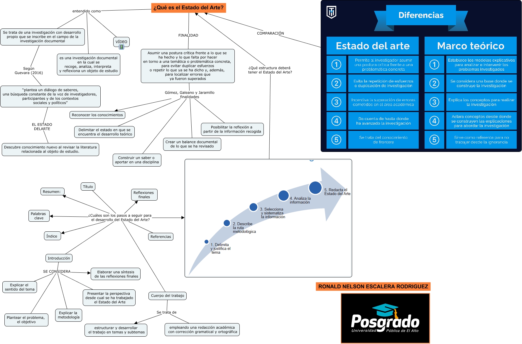 Este Cmap, tiene información relacionada con: ESTADO DEL ARTE, ¿Qué es el Estado del Arte? entendido como Se trata de una investigación con desarrollo propio que se inscribe en el campo de la investigación documental, Asumir una postura crítica frente a lo que se ha hecho y lo que falta por hacer en torno a una temática o problemática concreta, para evitar duplicar esfuerzos o repetir lo que ya se ha dicho y, además, para localizar errores que ya fueron superados Gómez, Galeano y Jaramillo finalidades Crear un balance documental de lo que se ha revisado, Título ¿Cuáles son los pasos a seguir para el desarrollo del Estado del Arte? Referencias, COMPARACIÓN ¿Qué es el Estado del Arte?, Título ¿Cuáles son los pasos a seguir para el desarrollo del Estado del Arte? Palabras clave, Introducción SE CONSIDERA Explicar la metodología, Asumir una postura crítica frente a lo que se ha hecho y lo que falta por hacer en torno a una temática o problemática concreta, para evitar duplicar esfuerzos o repetir lo que ya se ha dicho y, además, para localizar errores que ya fueron superados Gómez, Galeano y Jaramillo finalidades Posibilitar la reflexión a partir de la información recogida, ¿Qué estructura deberá tener el Estado del Arte? ¿Qué es el Estado del Arte?, Introducción SE CONSIDERA Presentar la perspectiva desde cual se ha trabajado el Estado del Arte, Introducción SE CONSIDERA Explicar el sentido del tema, Título ¿Cuáles son los pasos a seguir para el desarrollo del Estado del Arte? Introducción, Asumir una postura crítica frente a lo que se ha hecho y lo que falta por hacer en torno a una temática o problemática concreta, para evitar duplicar esfuerzos o repetir lo que ya se ha dicho y, además, para localizar errores que ya fueron superados Gómez, Galeano y Jaramillo finalidades Construir un saber o aportar en una disciplina, Se trata de una investigación con desarrollo propio que se inscribe en el campo de la investigación documental Según Guevara (2016) “plantea un diálogo de saberes, una búsqueda constante de la voz de investigadores, participantes y de los contextos sociales y políticos”, Introducción SE CONSIDERA Elaborar una síntesis de las reflexiones finales, Cuerpo del trabajo Se trata de estructurar y desarrollar el trabajo en temas y subtemas, ¿Qué es el Estado del Arte? entendido como VÍDEO, ¿Qué es el Estado del Arte? FINALIDAD Asumir una postura crítica frente a lo que se ha hecho y lo que falta por hacer en torno a una temática o problemática concreta, para evitar duplicar esfuerzos o repetir lo que ya se ha dicho y, además, para localizar errores que ya fueron superados, Asumir una postura crítica frente a lo que se ha hecho y lo que falta por hacer en torno a una temática o problemática concreta, para evitar duplicar esfuerzos o repetir lo que ya se ha dicho y, además, para localizar errores que ya fueron superados Gómez, Galeano y Jaramillo finalidades Delimitar el estado en que se encuentra el desarrollo teórico, Cuerpo del trabajo Se trata de empleando una redacción académica con corrección gramatical y ortográfica, ¿Qué es el Estado del Arte? entendido como es una investigación documental en la cual se recoge, analiza, interpreta y reflexiona un objeto de estudio