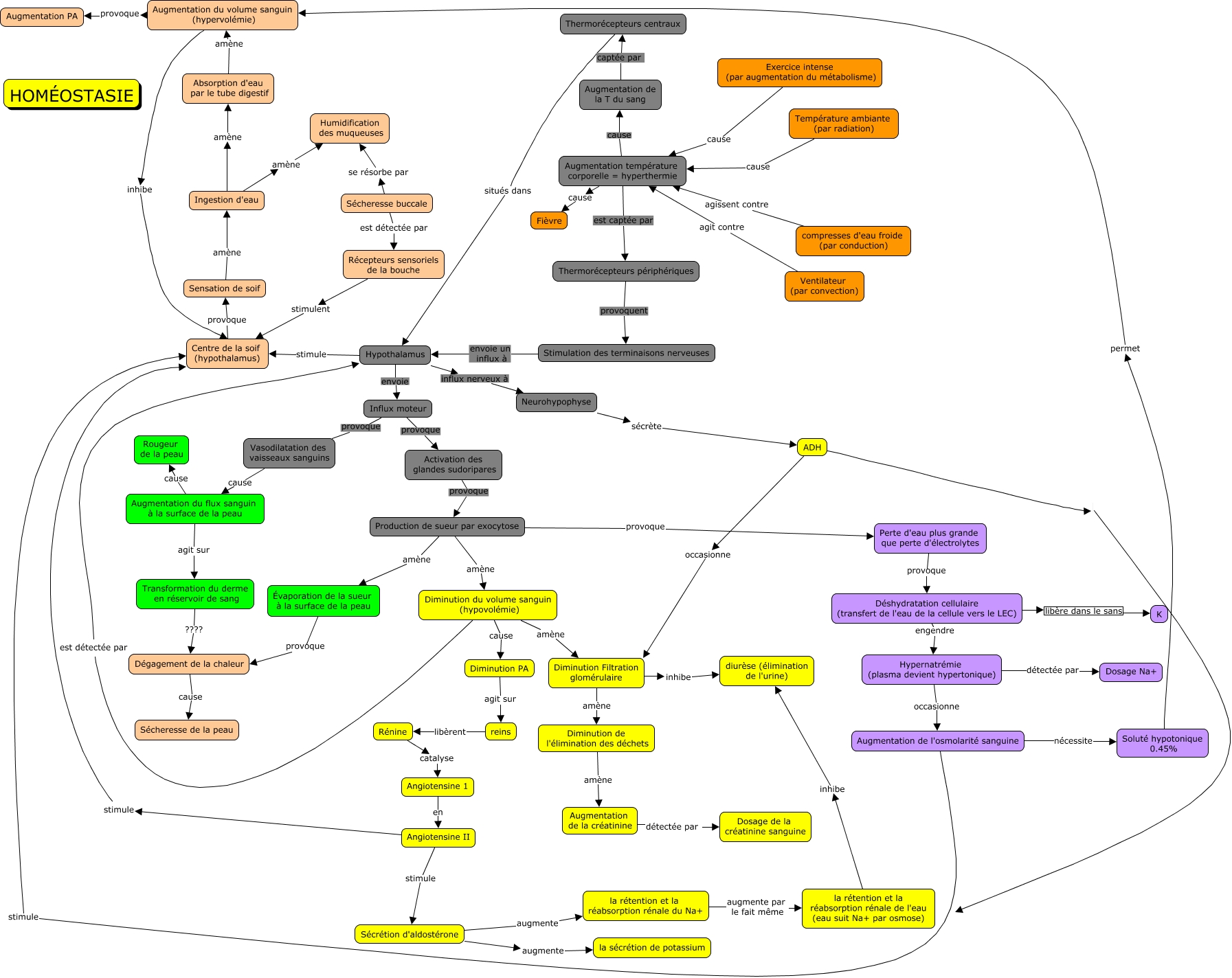 This Concept Map, created with IHMC CmapTools, has information related to: homesotasie et thermorégulation, Hypernatrémie (plasma devient hypertonique) détectée par Dosage Na+, Augmentation température corporelle = hyperthermie cause Augmentation de la T du sang, Augmentation température corporelle = hyperthermie est captée par Thermorécepteurs périphériques, Augmentation température corporelle = hyperthermie cause Fièvre, Récepteurs sensoriels de la bouche stimulent Centre de la soif (hypothalamus), Ingestion d'eau amène Humidification des muqueuses, Augmentation de l'osmolarité sanguine stimule Centre de la soif (hypothalamus), Stimulation des terminaisons nerveuses envoie un influx à Hypothalamus, Rénine catalyse Angiotensine 1, Diminution PA agit sur reins, Ingestion d'eau amène Absorption d'eau par le tube digestif, Production de sueur par exocytose provoque Perte d'eau plus grande que perte d'électrolytes, ADH, Déshydratation cellulaire (transfert de l'eau de la cellule vers le LEC) libère dans le sans K, Perte d'eau plus grande que perte d'électrolytes provoque Déshydratation cellulaire (transfert de l'eau de la cellule vers le LEC), Diminution du volume sanguin (hypovolémie) cause Diminution PA, Thermorécepteurs périphériques provoquent Stimulation des terminaisons nerveuses, Sécheresse buccale se résorbe par Humidification des muqueuses, Augmentation du flux sanguin à la surface de la peau cause Rougeur de la peau, Diminution Filtration glomérulaire amène Diminution de l'élimination des déchets