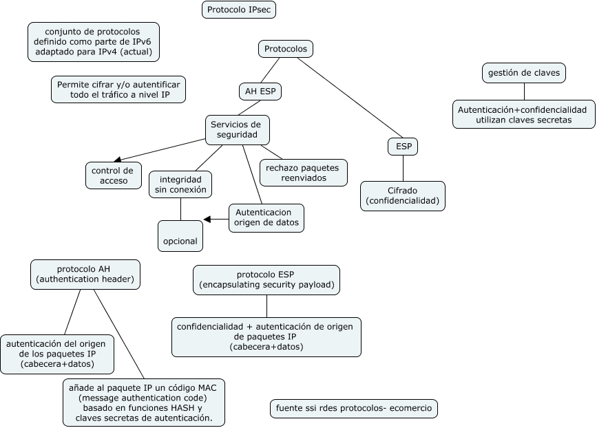 Este Cmap, tiene información relacionada con: IPsec, protocolo AH (authentication header) autenticación del origen de los paquetes IP (cabecera+datos), AH ESP Servicios de seguridad, Protocolos ESP, Autenticacion origen de datos opcional, gestión de claves Autenticación+confidencialidad utilizan claves secretas, integridad sin conexión opcional, Servicios de seguridad Autenticacion origen de datos, Protocolos AH ESP, Servicios de seguridad rechazo paquetes reenviados, ESP Cifrado (confidencialidad), Servicios de seguridad control de acceso, Servicios de seguridad integridad sin conexión, protocolo AH (authentication header) añade al paquete IP un código MAC (message authentication code) basado en funciones HASH y claves secretas de autenticación., protocolo ESP (encapsulating security payload) confidencialidad + autenticación de origen de paquetes IP (cabecera+datos)