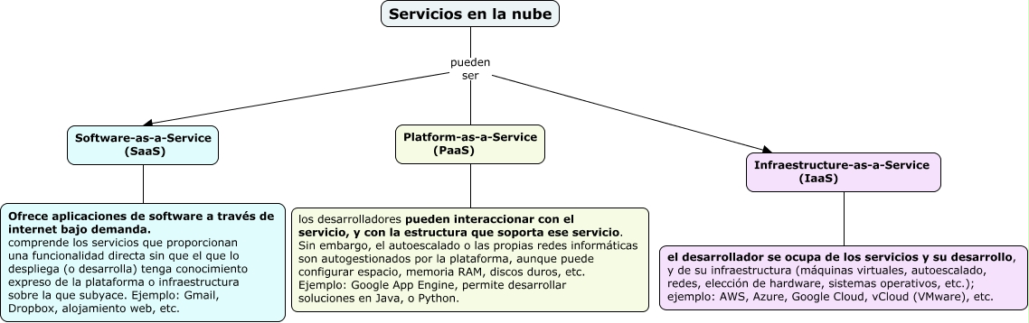 Este Cmap, tiene información relacionada con: Servicios en la nube, Servicios en la nube pueden ser Software-as-a-Service (SaaS), Software-as-a-Service (SaaS) comprende los servicios que proporcionan una funcionalidad directa sin que el que lo despliega (o desarrolla) tenga conocimiento expreso de la plataforma o infraestructura sobre la que subyace. Ejemplo: Gmail, Dropbox, alojamiento web, etc., Servicios en la nube pueden ser Platform-as-a-Service (PaaS), Infraestructure-as-a-Service (IaaS) el desarrollador se ocupa de los servicios y su desarrollo, y de su infraestructura (máquinas virtuales, autoescalado, redes, elección de hardware, sistemas operativos, etc.); ejemplo: AWS, Azure, Google Cloud, vCloud (VMware), etc., Platform-as-a-Service (PaaS) los desarrolladores pueden interaccionar con el servicio, y con la estructura que soporta ese servicio. Sin embargo, el autoescalado o las propias redes informáticas son autogestionados por la plataforma, aunque puede configurar espacio, memoria RAM, discos duros, etc. Ejemplo: Google App Engine, permite desarrollar soluciones en Java, o Python., Servicios en la nube pueden ser Infraestructure-as-a-Service (IaaS)