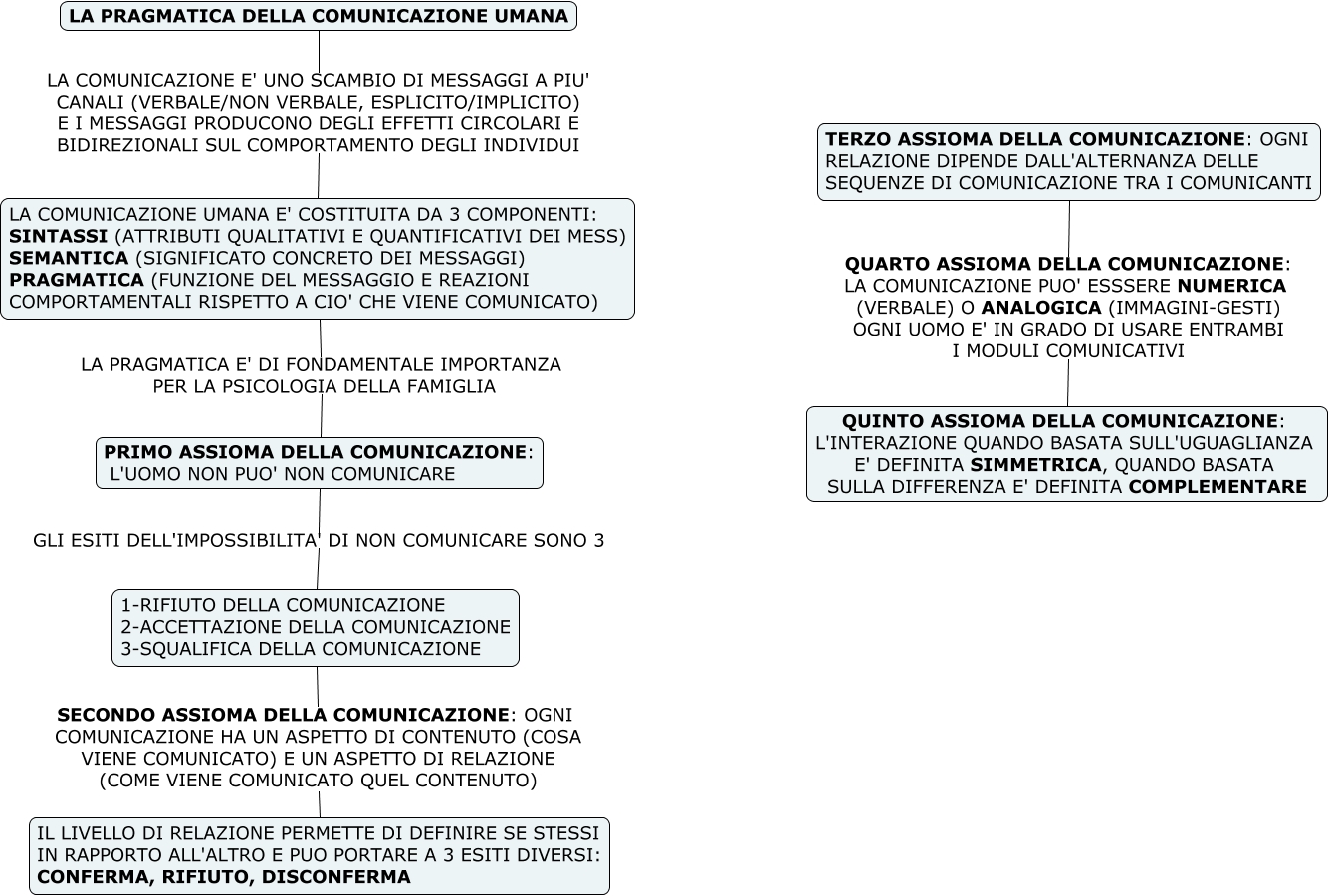 Questa Cmap, creata con IHMC CmapTools, contiene informazioni relative a: B-LA PRAGMATICA DELLA COMUNICAZIONE UMANA, PRIMO ASSIOMA DELLA COMUNICAZIONE: L'UOMO NON PUO' NON COMUNICARE GLI ESITI DELL'IMPOSSIBILITA' DI NON COMUNICARE SONO 3 1-RIFIUTO DELLA COMUNICAZIONE 2-ACCETTAZIONE DELLA COMUNICAZIONE 3-SQUALIFICA DELLA COMUNICAZIONE, LA COMUNICAZIONE UMANA E' COSTITUITA DA 3 COMPONENTI: SINTASSI (ATTRIBUTI QUALITATIVI E QUANTIFICATIVI DEI MESS) SEMANTICA (SIGNIFICATO CONCRETO DEI MESSAGGI) PRAGMATICA (FUNZIONE DEL MESSAGGIO E REAZIONI COMPORTAMENTALI RISPETTO A CIO' CHE VIENE COMUNICATO) LA PRAGMATICA E' DI FONDAMENTALE IMPORTANZA PER LA PSICOLOGIA DELLA FAMIGLIA PRIMO ASSIOMA DELLA COMUNICAZIONE: L'UOMO NON PUO' NON COMUNICARE, TERZO ASSIOMA DELLA COMUNICAZIONE: OGNI RELAZIONE DIPENDE DALL'ALTERNANZA DELLE SEQUENZE DI COMUNICAZIONE TRA I COMUNICANTI QUARTO ASSIOMA DELLA COMUNICAZIONE: LA COMUNICAZIONE PUO' ESSSERE NUMERICA (VERBALE) O ANALOGICA (IMMAGINI-GESTI) OGNI UOMO E' IN GRADO DI USARE ENTRAMBI I MODULI COMUNICATIVI QUINTO ASSIOMA DELLA COMUNICAZIONE: L'INTERAZIONE QUANDO BASATA SULL'UGUAGLIANZA E' DEFINITA SIMMETRICA, QUANDO BASATA SULLA DIFFERENZA E' DEFINITA COMPLEMENTARE, 1-RIFIUTO DELLA COMUNICAZIONE 2-ACCETTAZIONE DELLA COMUNICAZIONE 3-SQUALIFICA DELLA COMUNICAZIONE SECONDO ASSIOMA DELLA COMUNICAZIONE: OGNI COMUNICAZIONE HA UN ASPETTO DI CONTENUTO (COSA VIENE COMUNICATO) E UN ASPETTO DI RELAZIONE (COME VIENE COMUNICATO QUEL CONTENUTO) IL LIVELLO DI RELAZIONE PERMETTE DI DEFINIRE SE STESSI IN RAPPORTO ALL'ALTRO E PUO PORTARE A 3 ESITI DIVERSI: CONFERMA, RIFIUTO, DISCONFERMA, LA PRAGMATICA DELLA COMUNICAZIONE UMANA LA COMUNICAZIONE E' UNO SCAMBIO DI MESSAGGI A PIU' CANALI (VERBALE/NON VERBALE, ESPLICITO/IMPLICITO) E I MESSAGGI PRODUCONO DEGLI EFFETTI CIRCOLARI E BIDIREZIONALI SUL COMPORTAMENTO DEGLI INDIVIDUI LA COMUNICAZIONE UMANA E' COSTITUITA DA 3 COMPONENTI: SINTASSI (ATTRIBUTI QUALITATIVI E QUANTIFICATIVI DEI MESS) SEMANTICA (SIGNIFICATO CONCRETO DEI MESSAGGI) PRAGMATICA (FUNZIONE DEL MESSAGGIO E REAZIONI COMPORTAMENTALI RISPETTO A CIO' CHE VIENE COMUNICATO)
