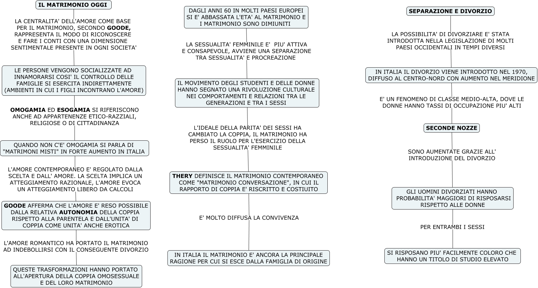 Questa Cmap, creata con IHMC CmapTools, contiene informazioni relative a: D- IL MATRIMONIO OGGI, SEPARAZIONE E DIVORZIO LA POSSIBILITA' DI DIVORZIARE E' STATA INTRODOTTA NELLA LEGISLAZIONE DI MOLTI PAESI OCCIDENTALI IN TEMPI DIVERSI IN ITALIA IL DIVORZIO VIENE INTRODOTTO NEL 1970, DIFFUSO AL CENTRO-NORD CON AUMENTO NEL MERIDIONE, SECONDE NOZZE SONO AUMENTATE GRAZIE ALL' INTRODUZIONE DEL DIVORZIO GLI UOMINI DIVORZIATI HANNO PROBABILITA' MAGGIORI DI RISPOSARSI RISPETTO ALLE DONNE, IL MOVIMENTO DEGLI STUDENTI E DELLE DONNE HANNO SEGNATO UNA RIVOLUZIONE CULTURALE NEI COMPORTAMENTI E RELAZIONI TRA LE GENERAZIONI E TRA I SESSI L'IDEALE DELLA PARITA' DEI SESSI HA CAMBIATO LA COPPIA, IL MATRIMONIO HA PERSO IL RUOLO PER L'ESERCIZIO DELLA SESSUALITA' FEMMINILE THERY DEFINISCE IL MATRIMONIO CONTEMPORANEO COME "MATRIMONIO CONVERSAZIONE", IN CUI IL RAPPORTO DI COPPIA E' RISCRITTO E COSTIUITO, DAGLI ANNI 60 IN MOLTI PAESI EUROPEI SI E' ABBASSATA L'ETA' AL MATRIMONIO E I MATRIMONIO SONO DIMIUNITI LA SESSUALITA' FEMMINILE E' PIU' ATTIVA E CONSAPEVOLE, AVVIENE UNA SEPARAZIONE TRA SESSUALITA' E PROCREAZIONE IL MOVIMENTO DEGLI STUDENTI E DELLE DONNE HANNO SEGNATO UNA RIVOLUZIONE CULTURALE NEI COMPORTAMENTI E RELAZIONI TRA LE GENERAZIONI E TRA I SESSI, IL MATRIMONIO OGGI LA CENTRALITA' DELL'AMORE COME BASE PER IL MATRIMONIO, SECONDO GOODE, RAPPRESENTA IL MODO DI RICONOSCERE E FARE I CONTI CON UNA DIMENSIONE SENTIMENTALE PRESENTE IN OGNI SOCIETA' LE PERSONE VENGONO SOCIALIZZATE AD INNAMORARSI COSI' IL CONTROLLO DELLE FAMIGLIE SI ESERCITA INDIRETTAMENTE (AMBIENTI IN CUI I FIGLI INCONTRANO L'AMORE), GLI UOMINI DIVORZIATI HANNO PROBABILITA' MAGGIORI DI RISPOSARSI RISPETTO ALLE DONNE PER ENTRAMBI I SESSI SI RISPOSANO PIU' FACILMENTE COLORO CHE HANNO UN TITOLO DI STUDIO ELEVATO, THERY DEFINISCE IL MATRIMONIO CONTEMPORANEO COME "MATRIMONIO CONVERSAZIONE", IN CUI IL RAPPORTO DI COPPIA E' RISCRITTO E COSTIUITO E' MOLTO DIFFUSA LA CONVIVENZA IN ITALIA IL MATRIMONIO E' ANCORA LA PRINCIPALE RAGIONE PER CUI SI ESCE DALLA FAMIGLIA DI ORIGINE, QUANDO NON C'E' OMOGAMIA SI PARLA DI "MATRIMONI MISTI" IN FORTE AUMENTO IN ITALIA L'AMORE CONTEMPORANEO E' REGOLATO DALLA SCELTA E DALL' AMORE. LA SCELTA IMPLICA UN ATTEGGIAMENTO RAZIONALE, L'AMORE EVOCA UN ATTEGGIAMENTO LIBERO DA CALCOLI GOODE AFFERMA CHE L'AMORE E' RESO POSSIBILE DALLA RELATIVA AUTONOMIA DELLA COPPIA RISPETTO ALLA PARENTELA E DALL'UNITA' DI COPPIA COME UNITA' ANCHE EROTICA, GOODE AFFERMA CHE L'AMORE E' RESO POSSIBILE DALLA RELATIVA AUTONOMIA DELLA COPPIA RISPETTO ALLA PARENTELA E DALL'UNITA' DI COPPIA COME UNITA' ANCHE EROTICA L'AMORE ROMANTICO HA PORTATO IL MATRIMONIO AD INDEBOLLIRSI CON IL CONSEGUENTE DIVORZIO QUESTE TRASFORMAZIONI HANNO PORTATO ALL'APERTURA DELLA COPPIA OMOSESSUALE E DEL LORO MATRIMONIO, LE PERSONE VENGONO SOCIALIZZATE AD INNAMORARSI COSI' IL CONTROLLO DELLE FAMIGLIE SI ESERCITA INDIRETTAMENTE (AMBIENTI IN CUI I FIGLI INCONTRANO L'AMORE) OMOGAMIA ED ESOGAMIA SI RIFERISCONO ANCHE AD APPARTENENZE ETICO-RAZZIALI, RELIGIOSE O DI CITTADINANZA QUANDO NON C'E' OMOGAMIA SI PARLA DI "MATRIMONI MISTI" IN FORTE AUMENTO IN ITALIA, IN ITALIA IL DIVORZIO VIENE INTRODOTTO NEL 1970, DIFFUSO AL CENTRO-NORD CON AUMENTO NEL MERIDIONE E' UN FENOMENO DI CLASSE MEDIO-ALTA, DOVE LE DONNE HANNO TASSI DI OCCUPAZIONE PIU' ALTI SECONDE NOZZE