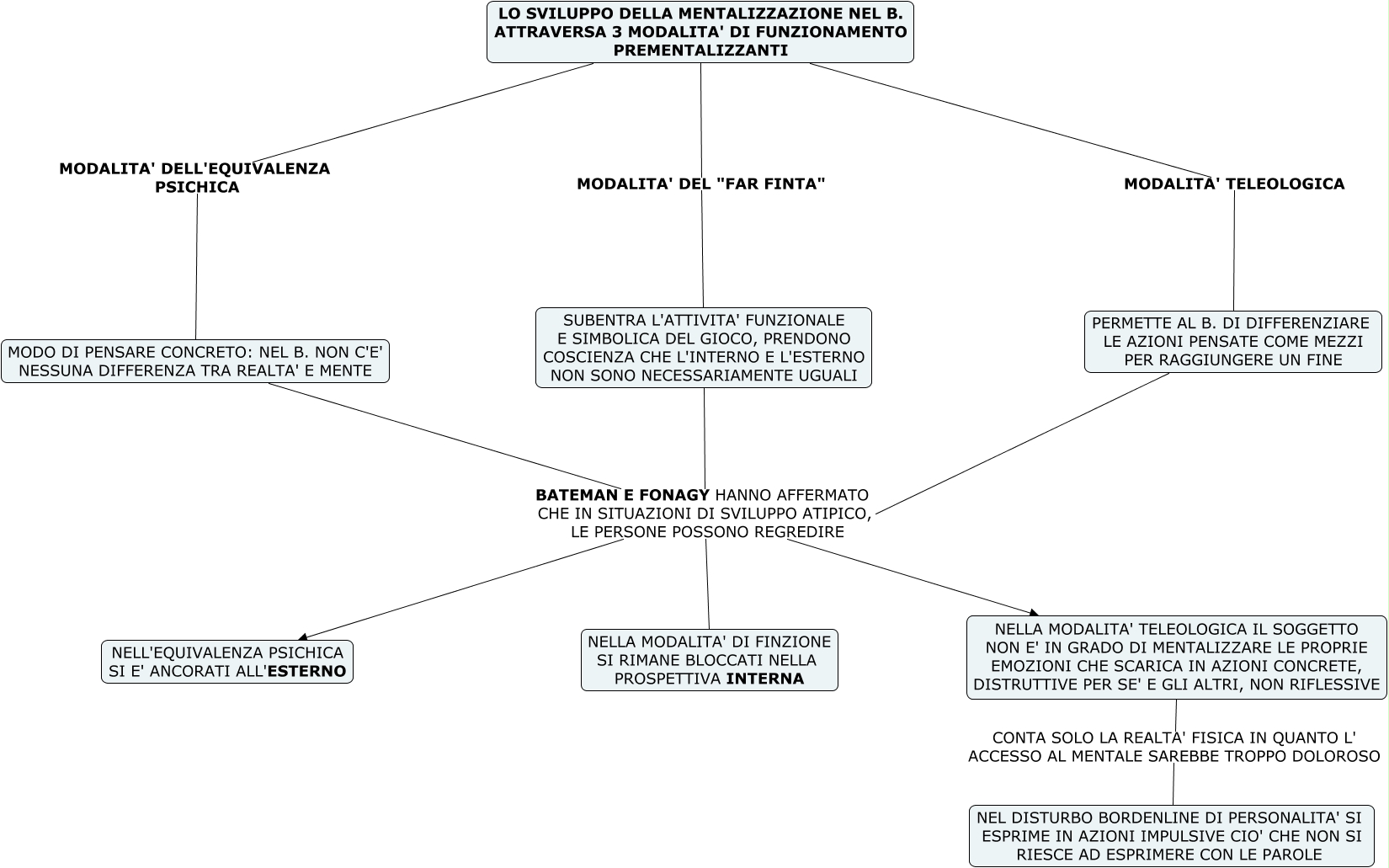 Questa Cmap, creata con IHMC CmapTools, contiene informazioni relative a: M- MODALITA' DI FUNZIONAMENTO PREMENTALIZZANTI, MODO DI PENSARE CONCRETO: NEL B. NON C'E' NESSUNA DIFFERENZA TRA REALTA' E MENTE BATEMAN E FONAGY HANNO AFFERMATO CHE IN SITUAZIONI DI SVILUPPO ATIPICO, LE PERSONE POSSONO REGREDIRE NELLA MODALITA' TELEOLOGICA IL SOGGETTO NON E' IN GRADO DI MENTALIZZARE LE PROPRIE EMOZIONI CHE SCARICA IN AZIONI CONCRETE, DISTRUTTIVE PER SE' E GLI ALTRI, NON RIFLESSIVE, SUBENTRA L'ATTIVITA' FUNZIONALE E SIMBOLICA DEL GIOCO, PRENDONO COSCIENZA CHE L'INTERNO E L'ESTERNO NON SONO NECESSARIAMENTE UGUALI BATEMAN E FONAGY HANNO AFFERMATO CHE IN SITUAZIONI DI SVILUPPO ATIPICO, LE PERSONE POSSONO REGREDIRE NELL'EQUIVALENZA PSICHICA SI E' ANCORATI ALL'ESTERNO, PERMETTE AL B. DI DIFFERENZIARE LE AZIONI PENSATE COME MEZZI PER RAGGIUNGERE UN FINE BATEMAN E FONAGY HANNO AFFERMATO CHE IN SITUAZIONI DI SVILUPPO ATIPICO, LE PERSONE POSSONO REGREDIRE NELLA MODALITA' DI FINZIONE SI RIMANE BLOCCATI NELLA PROSPETTIVA INTERNA, LO SVILUPPO DELLA MENTALIZZAZIONE NEL B. ATTRAVERSA 3 MODALITA' DI FUNZIONAMENTO PREMENTALIZZANTI MODALITA' DEL "FAR FINTA" SUBENTRA L'ATTIVITA' FUNZIONALE E SIMBOLICA DEL GIOCO, PRENDONO COSCIENZA CHE L'INTERNO E L'ESTERNO NON SONO NECESSARIAMENTE UGUALI, LO SVILUPPO DELLA MENTALIZZAZIONE NEL B. ATTRAVERSA 3 MODALITA' DI FUNZIONAMENTO PREMENTALIZZANTI MODALITA' TELEOLOGICA PERMETTE AL B. DI DIFFERENZIARE LE AZIONI PENSATE COME MEZZI PER RAGGIUNGERE UN FINE, LO SVILUPPO DELLA MENTALIZZAZIONE NEL B. ATTRAVERSA 3 MODALITA' DI FUNZIONAMENTO PREMENTALIZZANTI MODALITA' DELL'EQUIVALENZA PSICHICA MODO DI PENSARE CONCRETO: NEL B. NON C'E' NESSUNA DIFFERENZA TRA REALTA' E MENTE, SUBENTRA L'ATTIVITA' FUNZIONALE E SIMBOLICA DEL GIOCO, PRENDONO COSCIENZA CHE L'INTERNO E L'ESTERNO NON SONO NECESSARIAMENTE UGUALI BATEMAN E FONAGY HANNO AFFERMATO CHE IN SITUAZIONI DI SVILUPPO ATIPICO, LE PERSONE POSSONO REGREDIRE NELLA MODALITA' TELEOLOGICA IL SOGGETTO NON E' IN GRADO DI MENTALIZZARE LE PROPRIE EMOZIONI CHE SCARICA IN AZIONI CONCRETE, DISTRUTTIVE PER SE' E GLI ALTRI, NON RIFLESSIVE, PERMETTE AL B. DI DIFFERENZIARE LE AZIONI PENSATE COME MEZZI PER RAGGIUNGERE UN FINE BATEMAN E FONAGY HANNO AFFERMATO CHE IN SITUAZIONI DI SVILUPPO ATIPICO, LE PERSONE POSSONO REGREDIRE NELLA MODALITA' TELEOLOGICA IL SOGGETTO NON E' IN GRADO DI MENTALIZZARE LE PROPRIE EMOZIONI CHE SCARICA IN AZIONI CONCRETE, DISTRUTTIVE PER SE' E GLI ALTRI, NON RIFLESSIVE, MODO DI PENSARE CONCRETO: NEL B. NON C'E' NESSUNA DIFFERENZA TRA REALTA' E MENTE BATEMAN E FONAGY HANNO AFFERMATO CHE IN SITUAZIONI DI SVILUPPO ATIPICO, LE PERSONE POSSONO REGREDIRE NELL'EQUIVALENZA PSICHICA SI E' ANCORATI ALL'ESTERNO, PERMETTE AL B. DI DIFFERENZIARE LE AZIONI PENSATE COME MEZZI PER RAGGIUNGERE UN FINE BATEMAN E FONAGY HANNO AFFERMATO CHE IN SITUAZIONI DI SVILUPPO ATIPICO, LE PERSONE POSSONO REGREDIRE NELL'EQUIVALENZA PSICHICA SI E' ANCORATI ALL'ESTERNO, SUBENTRA L'ATTIVITA' FUNZIONALE E SIMBOLICA DEL GIOCO, PRENDONO COSCIENZA CHE L'INTERNO E L'ESTERNO NON SONO NECESSARIAMENTE UGUALI BATEMAN E FONAGY HANNO AFFERMATO CHE IN SITUAZIONI DI SVILUPPO ATIPICO, LE PERSONE POSSONO REGREDIRE NELLA MODALITA' DI FINZIONE SI RIMANE BLOCCATI NELLA PROSPETTIVA INTERNA, MODO DI PENSARE CONCRETO: NEL B. NON C'E' NESSUNA DIFFERENZA TRA REALTA' E MENTE BATEMAN E FONAGY HANNO AFFERMATO CHE IN SITUAZIONI DI SVILUPPO ATIPICO, LE PERSONE POSSONO REGREDIRE NELLA MODALITA' DI FINZIONE SI RIMANE BLOCCATI NELLA PROSPETTIVA INTERNA, NELLA MODALITA' TELEOLOGICA IL SOGGETTO NON E' IN GRADO DI MENTALIZZARE LE PROPRIE EMOZIONI CHE SCARICA IN AZIONI CONCRETE, DISTRUTTIVE PER SE' E GLI ALTRI, NON RIFLESSIVE CONTA SOLO LA REALTA' FISICA IN QUANTO L' ACCESSO AL MENTALE SAREBBE TROPPO DOLOROSO NEL DISTURBO BORDENLINE DI PERSONALITA' SI ESPRIME IN AZIONI IMPULSIVE CIO' CHE NON SI RIESCE AD ESPRIMERE CON LE PAROLE