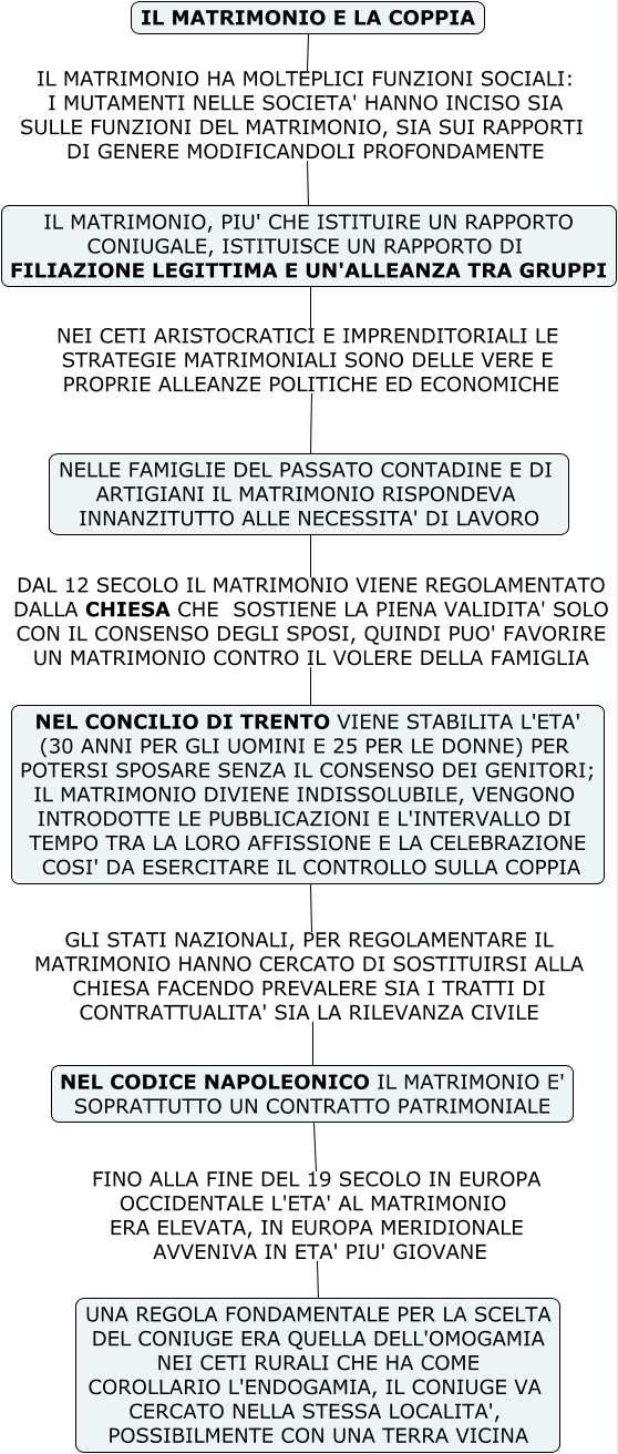 Questa Cmap, creata con IHMC CmapTools, contiene informazioni relative a: C- IL MATRIMONIO E LA COPPIA, IL MATRIMONIO, PIU' CHE ISTITUIRE UN RAPPORTO CONIUGALE, ISTITUISCE UN RAPPORTO DI FILIAZIONE LEGITTIMA E UN'ALLEANZA TRA GRUPPI NEI CETI ARISTOCRATICI E IMPRENDITORIALI LE STRATEGIE MATRIMONIALI SONO DELLE VERE E PROPRIE ALLEANZE POLITICHE ED ECONOMICHE NELLE FAMIGLIE DEL PASSATO CONTADINE E DI ARTIGIANI IL MATRIMONIO RISPONDEVA INNANZITUTTO ALLE NECESSITA' DI LAVORO, NEL CONCILIO DI TRENTO VIENE STABILITA L'ETA' (30 ANNI PER GLI UOMINI E 25 PER LE DONNE) PER POTERSI SPOSARE SENZA IL CONSENSO DEI GENITORI; IL MATRIMONIO DIVIENE INDISSOLUBILE, VENGONO INTRODOTTE LE PUBBLICAZIONI E L'INTERVALLO DI TEMPO TRA LA LORO AFFISSIONE E LA CELEBRAZIONE COSI' DA ESERCITARE IL CONTROLLO SULLA COPPIA GLI STATI NAZIONALI, PER REGOLAMENTARE IL MATRIMONIO HANNO CERCATO DI SOSTITUIRSI ALLA CHIESA FACENDO PREVALERE SIA I TRATTI DI CONTRATTUALITA' SIA LA RILEVANZA CIVILE NEL CODICE NAPOLEONICO IL MATRIMONIO E' SOPRATTUTTO UN CONTRATTO PATRIMONIALE, IL MATRIMONIO E LA COPPIA IL MATRIMONIO HA MOLTEPLICI FUNZIONI SOCIALI: I MUTAMENTI NELLE SOCIETA' HANNO INCISO SIA SULLE FUNZIONI DEL MATRIMONIO, SIA SUI RAPPORTI DI GENERE MODIFICANDOLI PROFONDAMENTE IL MATRIMONIO, PIU' CHE ISTITUIRE UN RAPPORTO CONIUGALE, ISTITUISCE UN RAPPORTO DI FILIAZIONE LEGITTIMA E UN'ALLEANZA TRA GRUPPI, NELLE FAMIGLIE DEL PASSATO CONTADINE E DI ARTIGIANI IL MATRIMONIO RISPONDEVA INNANZITUTTO ALLE NECESSITA' DI LAVORO DAL 12 SECOLO IL MATRIMONIO VIENE REGOLAMENTATO DALLA CHIESA CHE SOSTIENE LA PIENA VALIDITA' SOLO CON IL CONSENSO DEGLI SPOSI, QUINDI PUO' FAVORIRE UN MATRIMONIO CONTRO IL VOLERE DELLA FAMIGLIA NEL CONCILIO DI TRENTO VIENE STABILITA L'ETA' (30 ANNI PER GLI UOMINI E 25 PER LE DONNE) PER POTERSI SPOSARE SENZA IL CONSENSO DEI GENITORI; IL MATRIMONIO DIVIENE INDISSOLUBILE, VENGONO INTRODOTTE LE PUBBLICAZIONI E L'INTERVALLO DI TEMPO TRA LA LORO AFFISSIONE E LA CELEBRAZIONE COSI' DA ESERCITARE IL CONTROLLO SULLA COPPIA, NEL CODICE NAPOLEONICO IL MATRIMONIO E' SOPRATTUTTO UN CONTRATTO PATRIMONIALE FINO ALLA FINE DEL 19 SECOLO IN EUROPA OCCIDENTALE L'ETA' AL MATRIMONIO ERA ELEVATA, IN EUROPA MERIDIONALE AVVENIVA IN ETA' PIU' GIOVANE UNA REGOLA FONDAMENTALE PER LA SCELTA DEL CONIUGE ERA QUELLA DELL'OMOGAMIA NEI CETI RURALI CHE HA COME COROLLARIO L'ENDOGAMIA, IL CONIUGE VA CERCATO NELLA STESSA LOCALITA', POSSIBILMENTE CON UNA TERRA VICINA