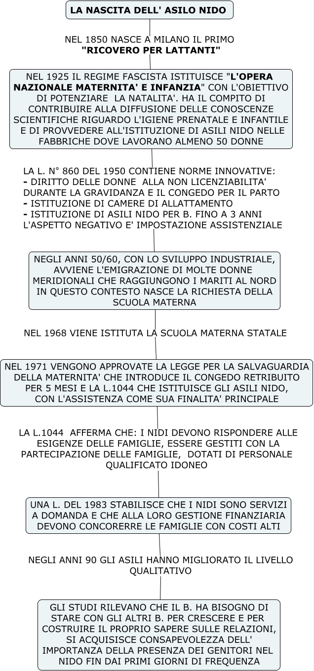 Questa Cmap, creata con IHMC CmapTools, contiene informazioni relative a: A- LA NASCITA DELL' ASILO NIDO, LA NASCITA DELL' ASILO NIDO NEL 1850 NASCE A MILANO IL PRIMO "RICOVERO PER LATTANTI" NEL 1925 IL REGIME FASCISTA ISTITUISCE "L'OPERA NAZIONALE MATERNITA' E INFANZIA" CON L'OBIETTIVO DI POTENZIARE LA NATALITA'. HA IL COMPITO DI CONTRIBUIRE ALLA DIFFUSIONE DELLE CONOSCENZE SCIENTIFICHE RIGUARDO L'IGIENE PRENATALE E INFANTILE E DI PROVVEDERE ALL'ISTITUZIONE DI ASILI NIDO NELLE FABBRICHE DOVE LAVORANO ALMENO 50 DONNE, UNA L. DEL 1983 STABILISCE CHE I NIDI SONO SERVIZI A DOMANDA E CHE ALLA LORO GESTIONE FINANZIARIA DEVONO CONCORERRE LE FAMIGLIE CON COSTI ALTI NEGLI ANNI 90 GLI ASILI HANNO MIGLIORATO IL LIVELLO QUALITATIVO GLI STUDI RILEVANO CHE IL B. HA BISOGNO DI STARE CON GLI ALTRI B. PER CRESCERE E PER COSTRUIRE IL PROPRIO SAPERE SULLE RELAZIONI, SI ACQUISISCE CONSAPEVOLEZZA DELL' IMPORTANZA DELLA PRESENZA DEI GENITORI NEL NIDO FIN DAI PRIMI GIORNI DI FREQUENZA, NEL 1971 VENGONO APPROVATE LA LEGGE PER LA SALVAGUARDIA DELLA MATERNITA' CHE INTRODUCE IL CONGEDO RETRIBUITO PER 5 MESI E LA L.1044 CHE ISTITUISCE GLI ASILI NIDO, CON L'ASSISTENZA COME SUA FINALITA' PRINCIPALE LA L.1044 AFFERMA CHE: I NIDI DEVONO RISPONDERE ALLE ESIGENZE DELLE FAMIGLIE, ESSERE GESTITI CON LA PARTECIPAZIONE DELLE FAMIGLIE, DOTATI DI PERSONALE QUALIFICATO IDONEO UNA L. DEL 1983 STABILISCE CHE I NIDI SONO SERVIZI A DOMANDA E CHE ALLA LORO GESTIONE FINANZIARIA DEVONO CONCORERRE LE FAMIGLIE CON COSTI ALTI, NEGLI ANNI 50/60, CON LO SVILUPPO INDUSTRIALE, AVVIENE L'EMIGRAZIONE DI MOLTE DONNE MERIDIONALI CHE RAGGIUNGONO I MARITI AL NORD IN QUESTO CONTESTO NASCE LA RICHIESTA DELLA SCUOLA MATERNA NEL 1968 VIENE ISTITUTA LA SCUOLA MATERNA STATALE NEL 1971 VENGONO APPROVATE LA LEGGE PER LA SALVAGUARDIA DELLA MATERNITA' CHE INTRODUCE IL CONGEDO RETRIBUITO PER 5 MESI E LA L.1044 CHE ISTITUISCE GLI ASILI NIDO, CON L'ASSISTENZA COME SUA FINALITA' PRINCIPALE, NEL 1925 IL REGIME FASCISTA ISTITUISCE "L'OPERA NAZIONALE MATERNITA' E INFANZIA" CON L'OBIETTIVO DI POTENZIARE LA NATALITA'. HA IL COMPITO DI CONTRIBUIRE ALLA DIFFUSIONE DELLE CONOSCENZE SCIENTIFICHE RIGUARDO L'IGIENE PRENATALE E INFANTILE E DI PROVVEDERE ALL'ISTITUZIONE DI ASILI NIDO NELLE FABBRICHE DOVE LAVORANO ALMENO 50 DONNE LA L. N° 860 DEL 1950 CONTIENE NORME INNOVATIVE: - DIRITTO DELLE DONNE ALLA NON LICENZIABILITA' DURANTE LA GRAVIDANZA E IL CONGEDO PER IL PARTO - ISTITUZIONE DI CAMERE DI ALLATTAMENTO - ISTITUZIONE DI ASILI NIDO PER B. FINO A 3 ANNI L'ASPETTO NEGATIVO E' IMPOSTAZIONE ASSISTENZIALE NEGLI ANNI 50/60, CON LO SVILUPPO INDUSTRIALE, AVVIENE L'EMIGRAZIONE DI MOLTE DONNE MERIDIONALI CHE RAGGIUNGONO I MARITI AL NORD IN QUESTO CONTESTO NASCE LA RICHIESTA DELLA SCUOLA MATERNA