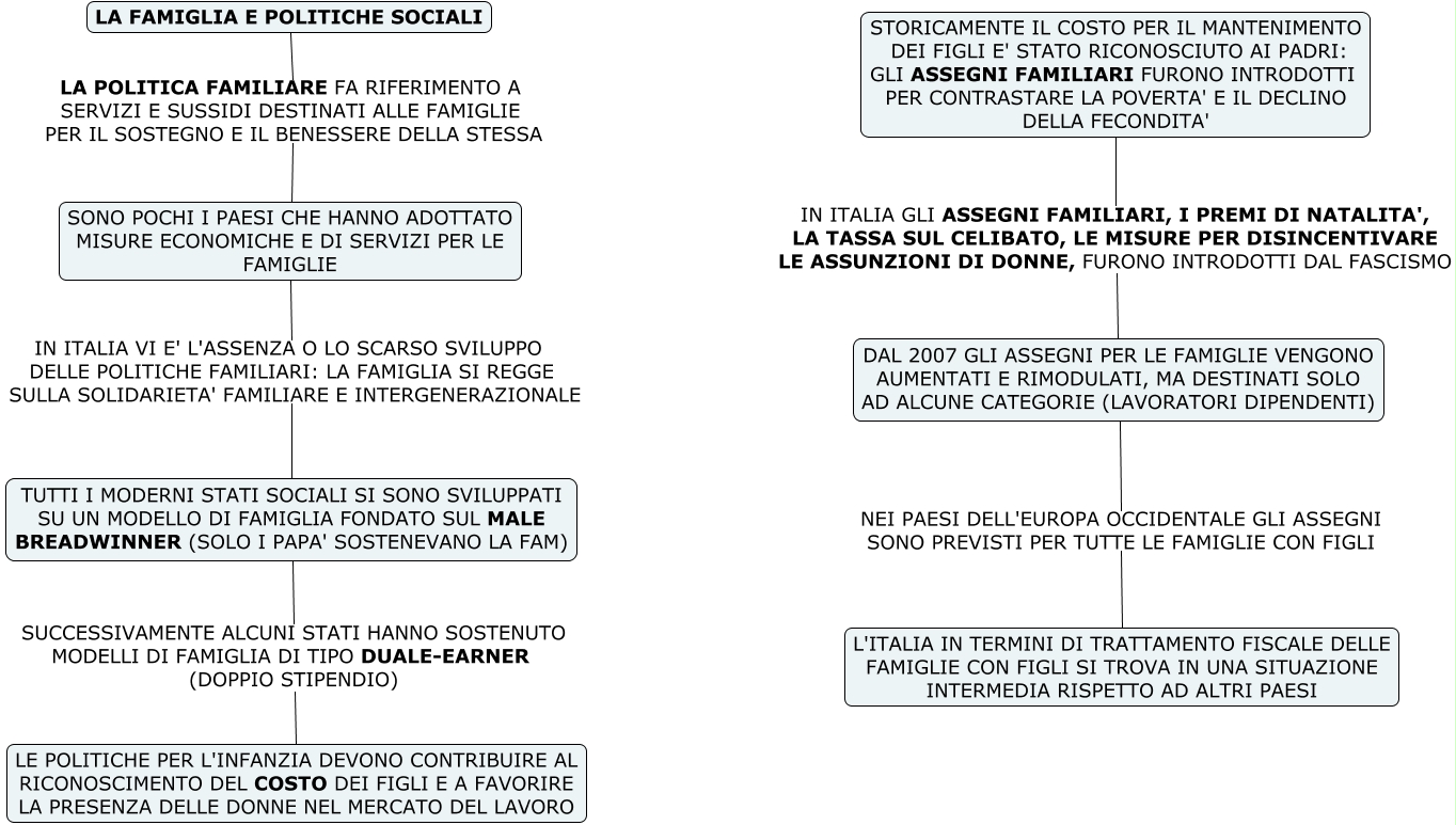 Questa Cmap, creata con IHMC CmapTools, contiene informazioni relative a: G- FAMIGLIA E POLITICHE SOCIALI, DAL 2007 GLI ASSEGNI PER LE FAMIGLIE VENGONO AUMENTATI E RIMODULATI, MA DESTINATI SOLO AD ALCUNE CATEGORIE (LAVORATORI DIPENDENTI) NEI PAESI DELL'EUROPA OCCIDENTALE GLI ASSEGNI SONO PREVISTI PER TUTTE LE FAMIGLIE CON FIGLI L'ITALIA IN TERMINI DI TRATTAMENTO FISCALE DELLE FAMIGLIE CON FIGLI SI TROVA IN UNA SITUAZIONE INTERMEDIA RISPETTO AD ALTRI PAESI, LA FAMIGLIA E POLITICHE SOCIALI LA POLITICA FAMILIARE FA RIFERIMENTO A SERVIZI E SUSSIDI DESTINATI ALLE FAMIGLIE PER IL SOSTEGNO E IL BENESSERE DELLA STESSA SONO POCHI I PAESI CHE HANNO ADOTTATO MISURE ECONOMICHE E DI SERVIZI PER LE FAMIGLIE, SONO POCHI I PAESI CHE HANNO ADOTTATO MISURE ECONOMICHE E DI SERVIZI PER LE FAMIGLIE IN ITALIA VI E' L'ASSENZA O LO SCARSO SVILUPPO DELLE POLITICHE FAMILIARI: LA FAMIGLIA SI REGGE SULLA SOLIDARIETA' FAMILIARE E INTERGENERAZIONALE TUTTI I MODERNI STATI SOCIALI SI SONO SVILUPPATI SU UN MODELLO DI FAMIGLIA FONDATO SUL MALE BREADWINNER (SOLO I PAPA' SOSTENEVANO LA FAM), STORICAMENTE IL COSTO PER IL MANTENIMENTO DEI FIGLI E' STATO RICONOSCIUTO AI PADRI: GLI ASSEGNI FAMILIARI FURONO INTRODOTTI PER CONTRASTARE LA POVERTA' E IL DECLINO DELLA FECONDITA' IN ITALIA GLI ASSEGNI FAMILIARI, I PREMI DI NATALITA', LA TASSA SUL CELIBATO, LE MISURE PER DISINCENTIVARE LE ASSUNZIONI DI DONNE, FURONO INTRODOTTI DAL FASCISMO DAL 2007 GLI ASSEGNI PER LE FAMIGLIE VENGONO AUMENTATI E RIMODULATI, MA DESTINATI SOLO AD ALCUNE CATEGORIE (LAVORATORI DIPENDENTI), TUTTI I MODERNI STATI SOCIALI SI SONO SVILUPPATI SU UN MODELLO DI FAMIGLIA FONDATO SUL MALE BREADWINNER (SOLO I PAPA' SOSTENEVANO LA FAM) SUCCESSIVAMENTE ALCUNI STATI HANNO SOSTENUTO MODELLI DI FAMIGLIA DI TIPO DUALE-EARNER (DOPPIO STIPENDIO) LE POLITICHE PER L'INFANZIA DEVONO CONTRIBUIRE AL RICONOSCIMENTO DEL COSTO DEI FIGLI E A FAVORIRE LA PRESENZA DELLE DONNE NEL MERCATO DEL LAVORO