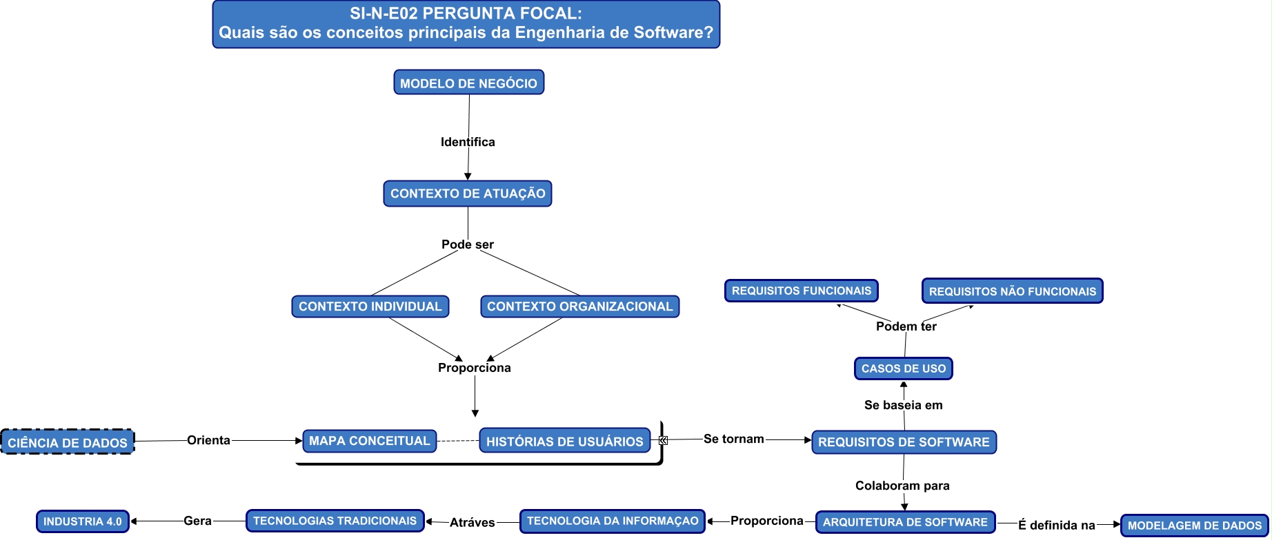 Esse mapa conceitual, produzido no IHMC CmapTools, tem a informação relacionada a: Sprint 4 SI-N-E02, CIÊNCIA DE DADOS Orienta MAPA CONCEITUAL, HISTÓRIAS DE USUÁRIOS Se tornam REQUISITOS DE SOFTWARE, MAPA CONCEITUAL HISTÓRIAS DE USUÁRIOS, TECNOLOGIAS TRADICIONAIS Gera INDUSTRIA 4.0, MODELO DE NEGÓCIO Identifica CONTEXTO DE ATUAÇÃO, ARQUITETURA DE SOFTWARE É definida na MODELAGEM DE DADOS, CONTEXTO INDIVIDUAL Proporciona MAPA CONCEITUAL E HISTÓRIAS DE USUÁRIOS, CONTEXTO ORGANIZACIONAL Proporciona MAPA CONCEITUAL E HISTÓRIAS DE USUÁRIOS, REQUISITOS DE SOFTWARE Colaboram para ARQUITETURA DE SOFTWARE, REQUISITOS DE SOFTWARE Se baseia em CASOS DE USO, CASOS DE USO Podem ter REQUISITOS FUNCIONAIS, ARQUITETURA DE SOFTWARE Proporciona TECNOLOGIA DA INFORMAÇAO, CONTEXTO DE ATUAÇÃO Pode ser CONTEXTO INDIVIDUAL, CONTEXTO DE ATUAÇÃO Pode ser CONTEXTO ORGANIZACIONAL, CASOS DE USO Podem ter REQUISITOS NÃO FUNCIONAIS, TECNOLOGIA DA INFORMAÇAO Atráves TECNOLOGIAS TRADICIONAIS