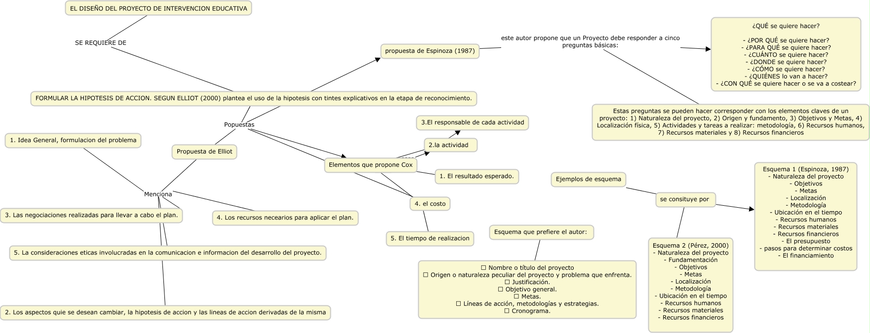 Este Cmap, tiene información relacionada con: mapa conceptual, FORMULAR LA HIPOTESIS DE ACCION. SEGUN ELLIOT (2000) plantea el uso de la hipotesis con tintes explicativos en la etapa de reconocimiento. Popuestas Elementos que propone Cox, 1. Idea General, formulacion del problema Menciona 3. Las negociaciones realizadas para llevar a cabo el plan., Propuesta de Elliot Menciona 3. Las negociaciones realizadas para llevar a cabo el plan., Estas preguntas se pueden hacer corresponder con los elementos claves de un proyecto: 1) Naturaleza del proyecto, 2) Origen y fundamento, 3) Objetivos y Metas, 4) Localización física, 5) Actividades y tareas a realizar: metodología, 6) Recursos humanos, 7) Recursos materiales y 8) Recursos financieros este autor propone que un Proyecto debe responder a cinco preguntas básicas: ¿QUÉ se quiere hacer? - ¿POR QUÉ se quiere hacer? - ¿PARA QUÉ se quiere hacer? - ¿CUÁNTO se quiere hacer? - ¿DONDE se quiere hacer? - ¿CÓMO se quiere hacer? - ¿QUIÉNES lo van a hacer? - ¿CON QUÉ se quiere hacer o se va a costear?, Elementos que propone Cox ???? 5. El tiempo de realizacion, FORMULAR LA HIPOTESIS DE ACCION. SEGUN ELLIOT (2000) plantea el uso de la hipotesis con tintes explicativos en la etapa de reconocimiento. Popuestas propuesta de Espinoza (1987), 4. Los recursos necearios para aplicar el plan. Menciona 2. Los aspectos quie se desean cambiar, la hipotesis de accion y las lineas de accion derivadas de la misma, EL DISEÑO DEL PROYECTO DE INTERVENCION EDUCATIVA SE REQUIERE DE FORMULAR LA HIPOTESIS DE ACCION. SEGUN ELLIOT (2000) plantea el uso de la hipotesis con tintes explicativos en la etapa de reconocimiento., 5. La consideraciones eticas involucradas en la comunicacion e informacion del desarrollo del proyecto. Menciona 3. Las negociaciones realizadas para llevar a cabo el plan., FORMULAR LA HIPOTESIS DE ACCION. SEGUN ELLIOT (2000) plantea el uso de la hipotesis con tintes explicativos en la etapa de reconocimiento. Popuestas 4. el costo, Elementos que propone Cox ???? 2.la actividad, 4. Los recursos necearios para aplicar el plan. Menciona 3. Las negociaciones realizadas para llevar a cabo el plan., propuesta de Espinoza (1987) este autor propone que un Proyecto debe responder a cinco preguntas básicas: ¿QUÉ se quiere hacer? - ¿POR QUÉ se quiere hacer? - ¿PARA QUÉ se quiere hacer? - ¿CUÁNTO se quiere hacer? - ¿DONDE se quiere hacer? - ¿CÓMO se quiere hacer? - ¿QUIÉNES lo van a hacer? - ¿CON QUÉ se quiere hacer o se va a costear?, Ejemplos de esquema ???? Esquema 1 (Espinoza, 1987) - Naturaleza del proyecto - Objetivos - Metas - Localización - Metodología - Ubicación en el tiempo - Recursos humanos - Recursos materiales - Recursos financieros - El presupuesto - pasos para determinar costos - El financiamiento, se consituye por ???? Esquema 2 (Pérez, 2000) - Naturaleza del proyecto - Fundamentación - Objetivos - Metas - Localización - Metodología - Ubicación en el tiempo - Recursos humanos - Recursos materiales - Recursos financieros, 5. La consideraciones eticas involucradas en la comunicacion e informacion del desarrollo del proyecto. Menciona 2. Los aspectos quie se desean cambiar, la hipotesis de accion y las lineas de accion derivadas de la misma, ???? ???? 1. El resultado esperado., Propuesta de Elliot Menciona 2. Los aspectos quie se desean cambiar, la hipotesis de accion y las lineas de accion derivadas de la misma, 1. Idea General, formulacion del problema Menciona 2. Los aspectos quie se desean cambiar, la hipotesis de accion y las lineas de accion derivadas de la misma, Elementos que propone Cox ???? 3.El responsable de cada actividad