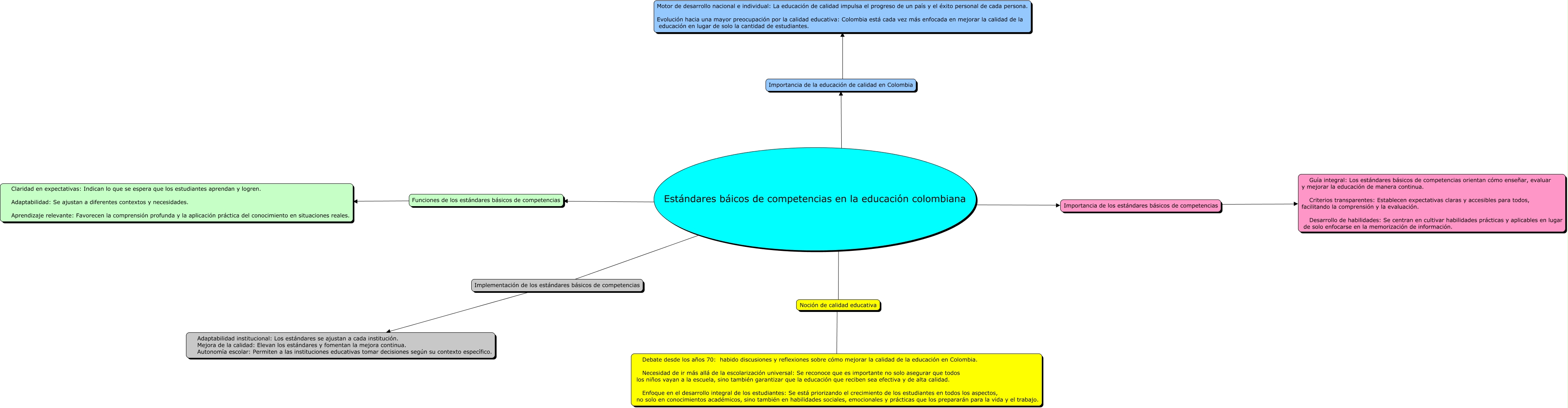 Este Cmap, tiene información relacionada con: mapa mental practicas yulie, Estándares báicos de competencias en la educación colombiana ???? Implementación de los estándares básicos de competencias, Estándares báicos de competencias en la educación colombiana ???? Importancia de la educación de calidad en Colombia, Estándares báicos de competencias en la educación colombiana ???? Noción de calidad educativa, Importancia de la educación de calidad en Colombia ???? Motor de desarrollo nacional e individual: La educación de calidad impulsa el progreso de un país y el éxito personal de cada persona. Evolución hacia una mayor preocupación por la calidad educativa: Colombia está cada vez más enfocada en mejorar la calidad de la educación en lugar de solo la cantidad de estudiantes., Estándares báicos de competencias en la educación colombiana ???? Funciones de los estándares básicos de competencias, Estándares báicos de competencias en la educación colombiana ???? Importancia de los estándares básicos de competencias, Noción de calidad educativa ???? Debate desde los años 70: habido discusiones y reflexiones sobre cómo mejorar la calidad de la educación en Colombia. Necesidad de ir más allá de la escolarización universal: Se reconoce que es importante no solo asegurar que todos los niños vayan a la escuela, sino también garantizar que la educación que reciben sea efectiva y de alta calidad. Enfoque en el desarrollo integral de los estudiantes: Se está priorizando el crecimiento de los estudiantes en todos los aspectos, no solo en conocimientos académicos, sino también en habilidades sociales, emocionales y prácticas que los prepararán para la vida y el trabajo., Implementación de los estándares básicos de competencias ???? Adaptabilidad institucional: Los estándares se ajustan a cada institución. Mejora de la calidad: Elevan los estándares y fomentan la mejora continua. Autonomía escolar: Permiten a las instituciones educativas tomar decisiones según su contexto específico., Importancia de los estándares básicos de competencias ???? Guía integral: Los estándares básicos de competencias orientan cómo enseñar, evaluar y mejorar la educación de manera continua. Criterios transparentes: Establecen expectativas claras y accesibles para todos, facilitando la comprensión y la evaluación. Desarrollo de habilidades: Se centran en cultivar habilidades prácticas y aplicables en lugar de solo enfocarse en la memorización de información., Funciones de los estándares básicos de competencias ???? Claridad en expectativas: Indican lo que se espera que los estudiantes aprendan y logren. Adaptabilidad: Se ajustan a diferentes contextos y necesidades. Aprendizaje relevante: Favorecen la comprensión profunda y la aplicación práctica del conocimiento en situaciones reales.