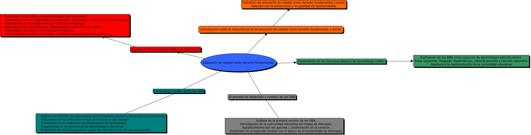 Este Cmap, tiene información relacionada con: mapa mental daniel 1 practica, Educación de calidad como derecho fundamental. ???? Comentarios finales sobre los DBA, Introducción sobre la importancia de la educación de calidad como derecho fundamental y social. ???? Definición de educación de calidad como derecho fundamental y social. Relación con la democracia y la igualdad de oportunidades, Educación de calidad como derecho fundamental. ???? Presentación de los Derechos Básicos de Aprendizaje (DBA)., Explicación de qué son los DBA y su estructura. ???? Definición de los DBA como aprendizajes estructurantes. Coherencia con los Lineamientos Curriculares y Estándares Básicos de Competencias. Importancia en la construcción de rutas de enseñanza. Articulación con los enfoques, metodologías y contextos educativos. Flexibilidad curricular y movilidad entre grados. Estructura de los DBA: enunciado, evidencias de aprendizaje y ejemplos., Comentarios finales sobre los DBA ???? Objetivo de facilitar la comprensión para docentes, padres y otros actores educativos. Naturaleza de los DBA como metas al finalizar el año escolar. Flexibilidad en el desarrollo de experiencias de aprendizaje. Importancia de las evidencias de aprendizaje y ejemplos. Posibilidad de contextualización según las características de los estudiantes., El proceso de desarrollo y revisión de los DBA ???? Análisis de la primera versión de los DBA. Participación de la comunidad educativa en mesas de discusión. Agradecimiento por los aportes y colaboración en la revisión. Desarrollo de la segunda versión con el apoyo de la Universidad de Antioquia., Educación de calidad como derecho fundamental. ???? Explicación de qué son los DBA y su estructura., Presentación de los Derechos Básicos de Aprendizaje (DBA). ???? Explicación de los DBA como conjunto de aprendizajes estructurantes. Áreas cubiertas: lenguaje, matemáticas, ciencias sociales y ciencias naturales. Apertura a la realimentación de la comunidad educativa, Educación de calidad como derecho fundamental. ???? Introducción sobre la importancia de la educación de calidad como derecho fundamental y social., Educación de calidad como derecho fundamental. ???? El proceso de desarrollo y revisión de los DBA