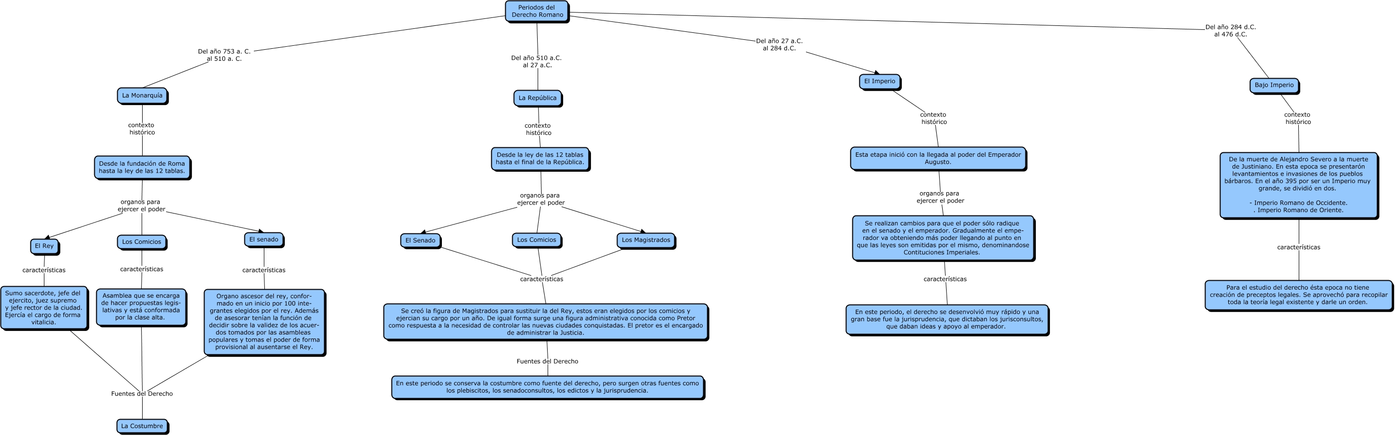 Este Cmap, tiene información relacionada con: Derecho Romano, Se creó la figura de Magistrados para sustituir la del Rey, estos eran elegidos por los comicios y ejercian su cargo por un año. De igual forma surge una figura administrativa conocida como Pretor como respuesta a la necesidad de controlar las nuevas ciudades conquistadas. El pretor es el encargado de administrar la Justicia. Fuentes del Derecho En este periodo se conserva la costumbre como fuente del derecho, pero surgen otras fuentes como los plebiscitos, los senadoconsultos, los edictos y la jurisprudencia., La República contexto histórico Desde la ley de las 12 tablas hasta el final de la República., El Rey características Sumo sacerdote, jefe del ejercito, juez supremo y jefe rector de la ciudad. Ejercía el cargo de forma vitalicia., El Senado características Se creó la figura de Magistrados para sustituir la del Rey, estos eran elegidos por los comicios y ejercian su cargo por un año. De igual forma surge una figura administrativa conocida como Pretor como respuesta a la necesidad de controlar las nuevas ciudades conquistadas. El pretor es el encargado de administrar la Justicia., Los Comicios características Se creó la figura de Magistrados para sustituir la del Rey, estos eran elegidos por los comicios y ejercian su cargo por un año. De igual forma surge una figura administrativa conocida como Pretor como respuesta a la necesidad de controlar las nuevas ciudades conquistadas. El pretor es el encargado de administrar la Justicia., Desde la fundación de Roma hasta la ley de las 12 tablas. organos para ejercer el poder Los Comicios, Periodos del Derecho Romano Del año 753 a. C. al 510 a. C. La Monarquía, Periodos del Derecho Romano Del año 284 d.C. al 476 d.C. Bajo Imperio, Periodos del Derecho Romano Del año 510 a.C. al 27 a.C. La República, Se realizan cambios para que el poder sólo radique en el senado y el emperador. Gradualmente el empe- rador va obteniendo más poder llegando al punto en que las leyes son emitidas por el mismo, denominandose Contituciones Imperiales. características En este periodo, el derecho se desenvolvió muy rápido y una gran base fue la jurisprudencia, que dictaban los jurisconsultos, que daban ideas y apoyo al emperador., El Imperio contexto histórico Esta etapa inició con la llegada al poder del Emperador Augusto., Desde la ley de las 12 tablas hasta el final de la República. organos para ejercer el poder Los Comicios, Los Magistrados características Se creó la figura de Magistrados para sustituir la del Rey, estos eran elegidos por los comicios y ejercian su cargo por un año. De igual forma surge una figura administrativa conocida como Pretor como respuesta a la necesidad de controlar las nuevas ciudades conquistadas. El pretor es el encargado de administrar la Justicia., Periodos del Derecho Romano Del año 27 a.C. al 284 d.C. El Imperio, Asamblea que se encarga de hacer propuestas legis- lativas y está conformada por la clase alta. Fuentes del Derecho La Costumbre, Desde la ley de las 12 tablas hasta el final de la República. organos para ejercer el poder El Senado, Esta etapa inició con la llegada al poder del Emperador Augusto. organos para ejercer el poder Se realizan cambios para que el poder sólo radique en el senado y el emperador. Gradualmente el empe- rador va obteniendo más poder llegando al punto en que las leyes son emitidas por el mismo, denominandose Contituciones Imperiales., Desde la fundación de Roma hasta la ley de las 12 tablas. organos para ejercer el poder El senado, Desde la ley de las 12 tablas hasta el final de la República. organos para ejercer el poder Los Magistrados, La Monarquía contexto histórico Desde la fundación de Roma hasta la ley de las 12 tablas.