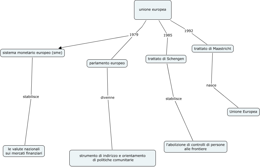 Questa Cmap, creata con IHMC CmapTools, contiene informazioni relative a: unione europea lubrano, parlamento europeo divenne strumento di indirizzo e orientamento di politiche comunitarie, trattato di Schengen stabilisce l'abolizione di controlli di persone alle frontiere, unione europea 1979 parlamento europeo, trattato di Maastricht nasce Unione Europea, unione europea 1985 trattato di Schengen, unione europea 1992 trattato di Maastricht, unione europea 1979 sistema monetario europeo (sme), sistema monetario europeo (sme) stabilisce le valute nazionali sui mercati finanziari