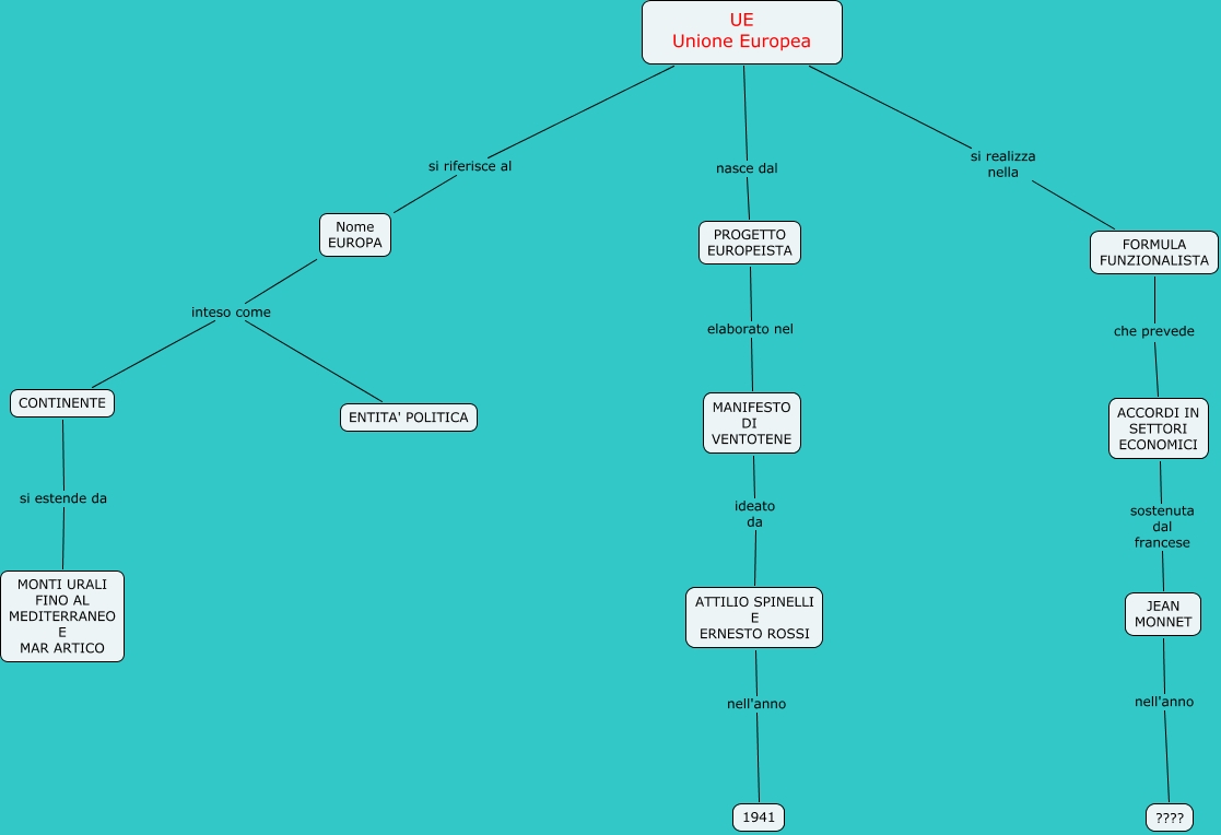 Questa Cmap, creata con IHMC CmapTools, contiene informazioni relative a: Unione Europea UE, FORMULA FUNZIONALISTA che prevede ACCORDI IN SETTORI ECONOMICI, PROGETTO EUROPEISTA elaborato nel MANIFESTO DI VENTOTENE, CONTINENTE si estende da MONTI URALI FINO AL MEDITERRANEO E MAR ARTICO, UE Unione Europea nasce dal PROGETTO EUROPEISTA, Nome EUROPA inteso come ENTITA' POLITICA, ATTILIO SPINELLI E ERNESTO ROSSI nell'anno 1941, ACCORDI IN SETTORI ECONOMICI sostenuta dal francese JEAN MONNET, MANIFESTO DI VENTOTENE ideato da ATTILIO SPINELLI E ERNESTO ROSSI, UE Unione Europea si realizza nella FORMULA FUNZIONALISTA, UE Unione Europea si riferisce al Nome EUROPA, Nome EUROPA inteso come CONTINENTE, JEAN MONNET nell'anno ????