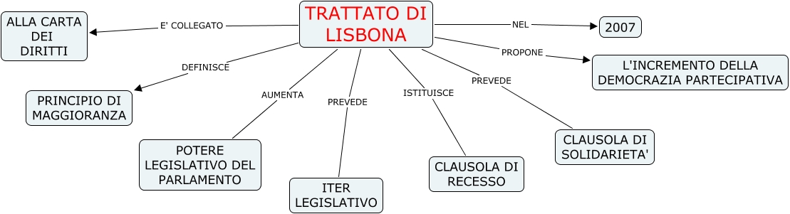 Questa Cmap, creata con IHMC CmapTools, contiene informazioni relative a: TRATTATO LISBONA-MORELLI ANDREA, TRATTATO DI LISBONA E' COLLEGATO ALLA CARTA DEI DIRITTI, TRATTATO DI LISBONA ISTITUISCE CLAUSOLA DI RECESSO, TRATTATO DI LISBONA PREVEDE CLAUSOLA DI SOLIDARIETA', TRATTATO DI LISBONA AUMENTA POTERE LEGISLATIVO DEL PARLAMENTO, TRATTATO DI LISBONA NEL 2007, TRATTATO DI LISBONA PROPONE L'INCREMENTO DELLA DEMOCRAZIA PARTECIPATIVA, TRATTATO DI LISBONA PREVEDE ITER LEGISLATIVO, TRATTATO DI LISBONA DEFINISCE PRINCIPIO DI MAGGIORANZA