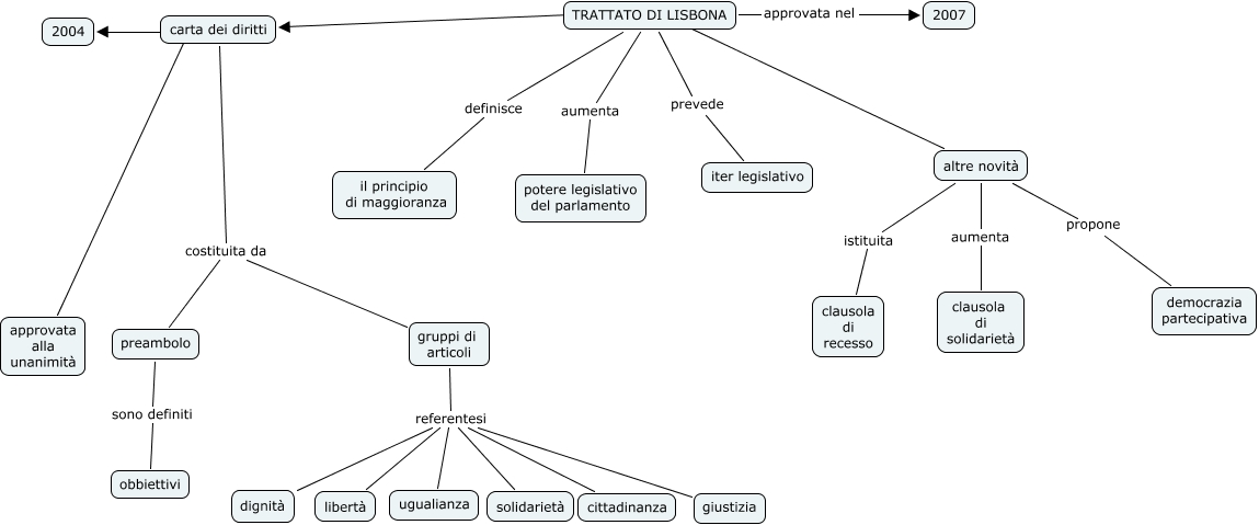 Questa Cmap, creata con IHMC CmapTools, contiene informazioni relative a: trattato di lisbona lubrano, carta dei diritti costituita da gruppi di articoli, gruppi di articoli referentesi solidarietà, TRATTATO DI LISBONA ???? altre novità, altre novità propone democrazia partecipativa, preambolo sono definiti obbiettivi, gruppi di articoli referentesi libertà, carta dei diritti ???? 2004, TRATTATO DI LISBONA ???? carta dei diritti, gruppi di articoli referentesi dignità, gruppi di articoli referentesi giustizia, TRATTATO DI LISBONA approvata nel 2007, altre novità aumenta clausola di solidarietà, TRATTATO DI LISBONA definisce il principio di maggioranza, carta dei diritti costituita da preambolo, TRATTATO DI LISBONA prevede iter legislativo, TRATTATO DI LISBONA aumenta potere legislativo del parlamento, gruppi di articoli referentesi ugualianza, altre novità istituita clausola di recesso, carta dei diritti ???? approvata alla unanimità, gruppi di articoli referentesi cittadinanza