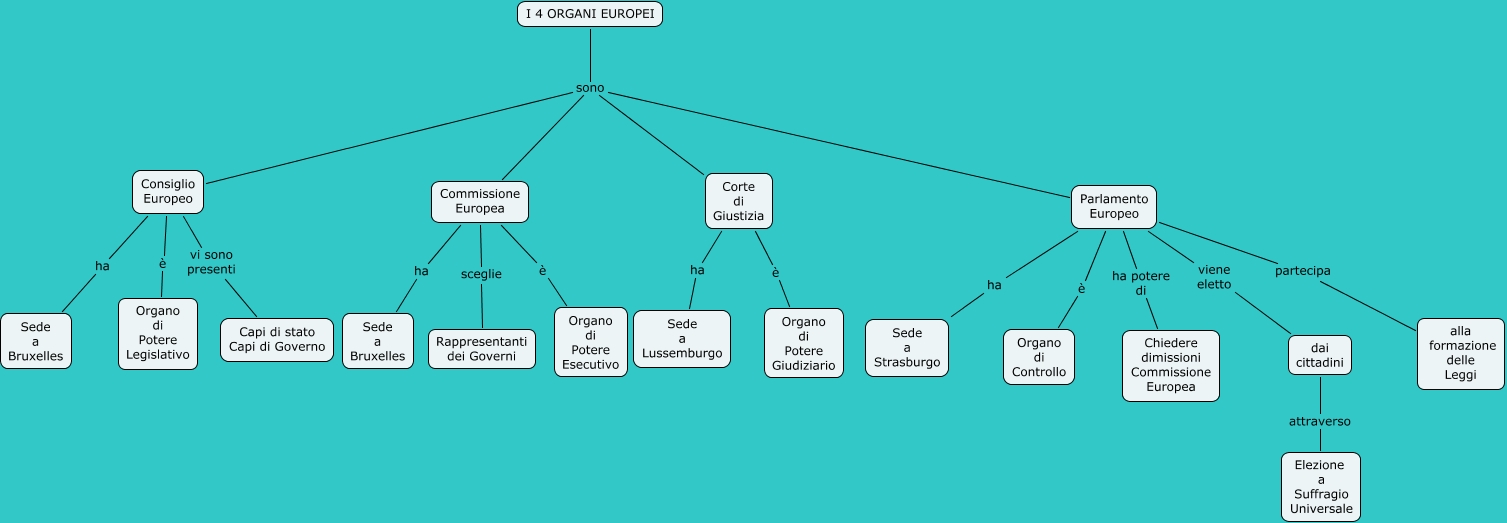 Questa Cmap, creata con IHMC CmapTools, contiene informazioni relative a: 4 organi UE, Commissione Europea ha Sede a Bruxelles, I 4 ORGANI EUROPEI sono Commissione Europea, Corte di Giustizia è Organo di Potere Giudiziario, dai cittadini attraverso Elezione a Suffragio Universale, Parlamento Europeo ha Sede a Strasburgo, I 4 ORGANI EUROPEI sono Consiglio Europeo, Commissione Europea sceglie Rappresentanti dei Governi, Consiglio Europeo vi sono presenti Capi di stato Capi di Governo, Consiglio Europeo ha Sede a Bruxelles, Parlamento Europeo è Organo di Controllo, Parlamento Europeo ha potere di Chiedere dimissioni Commissione Europea, Parlamento Europeo viene eletto dai cittadini, Commissione Europea è Organo di Potere Esecutivo, Corte di Giustizia ha Sede a Lussemburgo, I 4 ORGANI EUROPEI sono Parlamento Europeo, Consiglio Europeo è Organo di Potere Legislativo, I 4 ORGANI EUROPEI sono Corte di Giustizia, Parlamento Europeo partecipa alla formazione delle Leggi
