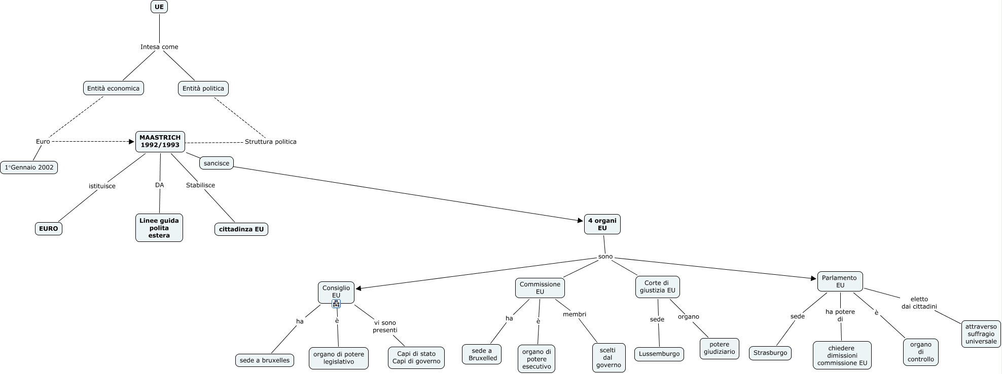 Questa Cmap, creata con IHMC CmapTools, contiene informazioni relative a: unione europea RAGONE, UE Intesa come Entità politica, MAASTRICH 1992/1993 Stabilisce cittadinza EU, Entità economica Euro MAASTRICH 1992/1993, Parlamento EU eletto dai cittadini attraverso suffragio universale, Parlamento EU ha potere di chiedere dimissioni commissione EU, Commissione EU è organo di potere esecutivo, MAASTRICH 1992/1993 ???? 4 organi EU, Consiglio EU ha sede a bruxelles, 4 organi EU sono Corte di giustizia EU, Commissione EU ha sede a Bruxelled, MAASTRICH 1992/1993 DA Linee guida polita estera, Commissione EU membri scelti dal governo, Entità economica Euro 1°Gennaio 2002, 4 organi EU sono Consiglio EU, Entità politica Struttura politica ????, Parlamento EU è organo di controllo, Parlamento EU sede Strasburgo, Corte di giustizia EU organo potere giudiziario, MAASTRICH 1992/1993 istituisce EURO, 4 organi EU sono Commissione EU