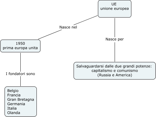 Questa Cmap, creata con IHMC CmapTools, contiene informazioni relative a: jessica unione europea, UE unione europea Nasce nel 1950 prima europa unita, UE unione europea Nasce per Salvaguardarsi dalle due grandi potenze: capitalismo e comunismo (Russia e America), 1950 prima europa unita I fondatori sono Belgio Francia Gran Bretagna Germania Italia Olanda