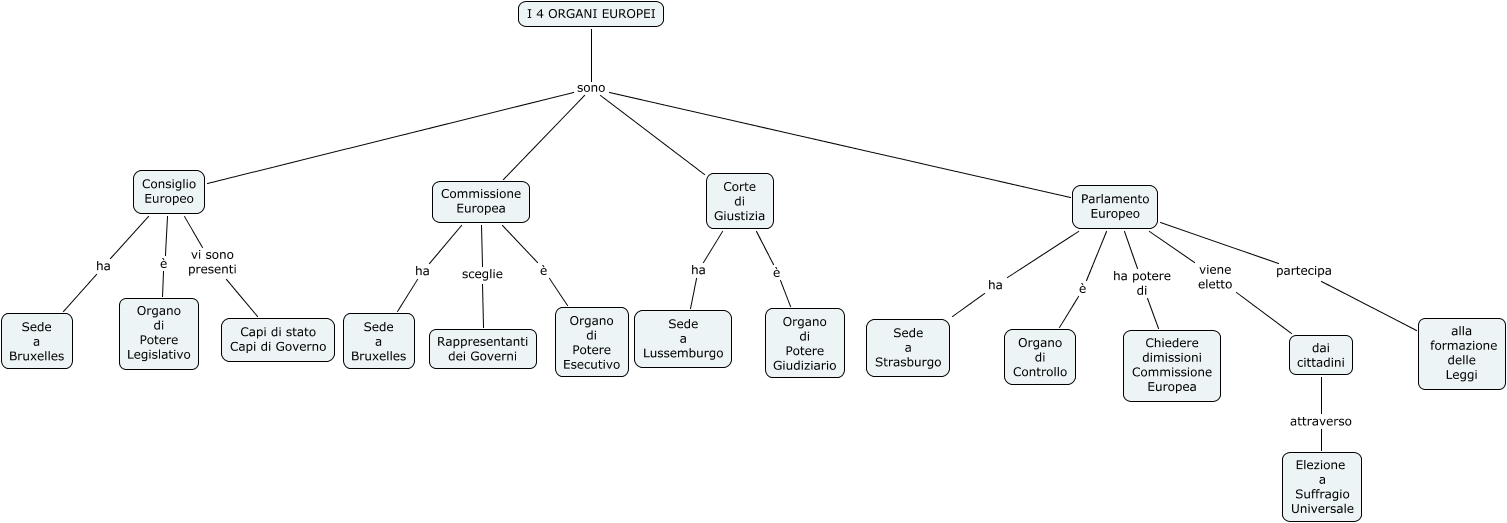 Questa Cmap, creata con IHMC CmapTools, contiene informazioni relative a: I 4 ORGANI EUROPEI, dai cittadini attraverso Elezione a Suffragio Universale, Consiglio Europeo vi sono presenti Capi di stato Capi di Governo, Commissione Europea è Organo di Potere Esecutivo, Corte di Giustizia è Organo di Potere Giudiziario, Parlamento Europeo viene eletto dai cittadini, Consiglio Europeo è Organo di Potere Legislativo, I 4 ORGANI EUROPEI sono Consiglio Europeo, Commissione Europea ha Sede a Bruxelles, Parlamento Europeo partecipa alla formazione delle Leggi, Parlamento Europeo ha Sede a Strasburgo, Parlamento Europeo ha potere di Chiedere dimissioni Commissione Europea, I 4 ORGANI EUROPEI sono Corte di Giustizia, Consiglio Europeo ha Sede a Bruxelles, I 4 ORGANI EUROPEI sono Parlamento Europeo, Corte di Giustizia ha Sede a Lussemburgo, Parlamento Europeo è Organo di Controllo, I 4 ORGANI EUROPEI sono Commissione Europea, Commissione Europea sceglie Rappresentanti dei Governi