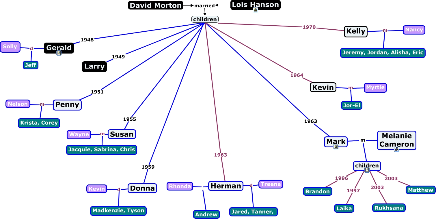 This Concept Map, created with IHMC CmapTools, has information related to: Morton Family Tree 2024, Herman d Treena, children 2003 Matthew, children 1996 Brandon, Mark m children, Herman d Jared, Tanner,, Gerald d Jeff, children 1959 Donna, Melanie Cameron m children, Lois Hanson married children, Herman Andrew, children 1949 Larry, children 1951 Penny, Kelly m Jeremy, Jordan, Alisha, Eric, children 1963 Mark, David Morton married children, children 1955 Susan, Penny m Nelson, children 1997 Laika, Gerald d Solly, Kevin m Myrtle