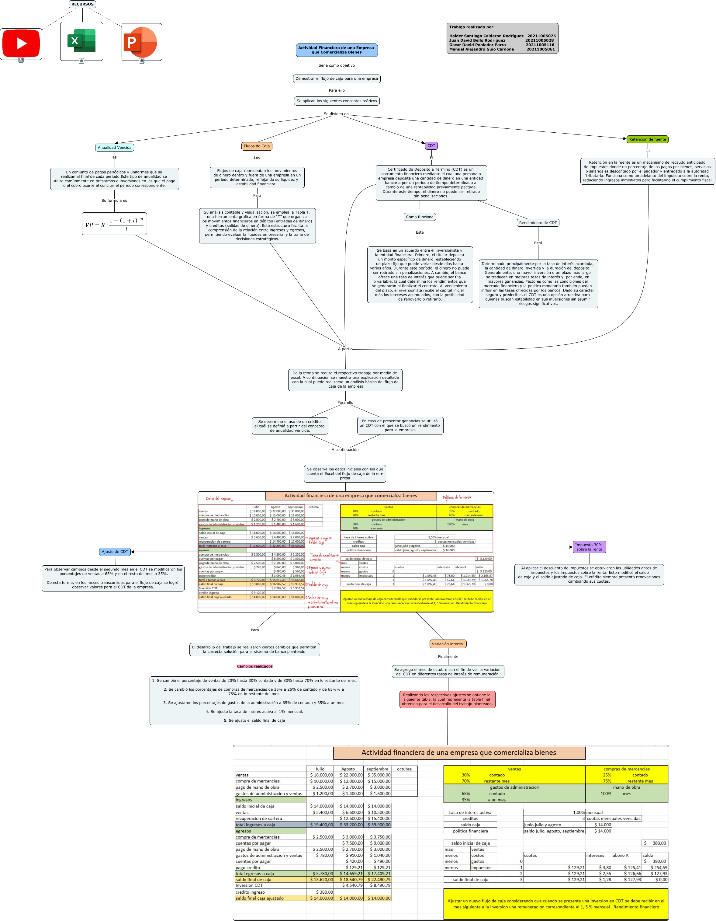 Este Cmap, tiene información relacionada con: Trabajo Final, RECURSOS ????, Flujos de caja representan los movimientos de dinero dentro y fuera de una empresa en un período determinado, reflejando su liquidez y estabilidad financiera. Para Su análisis contable y visualización, se emplea la Tabla T, una herramienta gráfica en forma de “T” que organiza los movimientos financieros en débitos (entradas de dinero) y créditos (salidas de dinero). Esta estructura facilita la comprensión de la relación entre ingresos y egresos, permitiendo evaluar la liquidez empresarial y la toma de decisiones estratégicas., Anualidad Vencida es Un conjunto de pagos periódicos y uniformes que se realizan al final de cada período.Este tipo de anualidad se utiliza comúnmente en préstamos o inversiones en las que el pago o el cobro ocurre al concluir el período correspondiente., Como funciona Éste Se basa en un acuerdo entre el inversionista y la entidad financiera. Primero, el titular deposita un monto específico de dinero, estableciendo un plazo fijo que puede variar desde días hasta varios años. Durante este período, el dinero no puede ser retirado sin penalizaciones. A cambio, el banco ofrece una tasa de interés que puede ser fija o variable, la cual determina los rendimientos que se generarán al finalizar el contrato. Al vencimiento del plazo, el inversionista recibe el capital inicial más los intereses acumulados, con la posibilidad de renovarlo o retirarlo., Actividad Financiera de una Empresa que Comercializa Bienes tiene como objetivo Demostrar el flujo de caja para una empresa, Para El desarrollo del trabajo se realizaron ciertos cambios que permiten la correcta solución para el sistema de banca planteado, Demostrar el flujo de caja para una empresa Para ello Se aplican los siguientes conceptos teóricos, Se aplican los siguientes conceptos teóricos Se dividen en Retencion de fuente, Impuesto 30% sobre la renta ???? Al aplicar el descuento de impuestos se obtuvieron las utilidades antes de impuestos y los impuestos sobre la renta. Esto modificó el saldo de caja y el saldo ajustado de caja. El crédito siempre presentó renovaciones cambiando sus cuotas., De la teoria se realiza el respectivo trabajo por medio de excel. A continuación se muestra una explicación detallada con la cuál puede realizarse un análisis básico del flujo de caja de la empresa Para ello Se determinó el uso de un crédito el cuál se definió a partir del concepto de anualidad vencida., Rendimiento de CDT Está Determinado principalmente por la tasa de interés acordada, la cantidad de dinero invertida y la duración del depósito. Generalmente, una mayor inversión o un plazo más largo se traducen en mejores tasas de interés y, por ende, en mayores ganancias. Factores como las condiciones del mercado financiero y la política monetaria también pueden influir en las tasas ofrecidas por los bancos. Dado su carácter seguro y predecible, el CDT es una opción atractiva para quienes buscan estabilidad en sus inversiones sin asumir riesgos significativos., RECURSOS ????, En caso de presentar ganancias se utilizó un CDT con el que se buscó un rendimiento para la empresa. A continuación Se observa los datos iniciales con los que cuenta el Excel del flujo de caja de la em- presa, Un conjunto de pagos periódicos y uniformes que se realizan al final de cada período.Este tipo de anualidad se utiliza comúnmente en préstamos o inversiones en las que el pago o el cobro ocurre al concluir el período correspondiente. Su formula es, Se observa los datos iniciales con los que cuenta el Excel del flujo de caja de la em- presa ????, A partir De la teoria se realiza el respectivo trabajo por medio de excel. A continuación se muestra una explicación detallada con la cuál puede realizarse un análisis básico del flujo de caja de la empresa, ???? Variación interés, Certificado de Depósito a Término (CDT) es un instrumento financiero mediante el cual una persona o empresa deposita una cantidad de dinero en una entidad bancaria por un período de tiempo determinado a cambio de una rentabilidad previamente pactada. Durante este tiempo, el dinero no puede ser retirado sin penalizaciones. ???? Rendimiento de CDT, Certificado de Depósito a Término (CDT) es un instrumento financiero mediante el cual una persona o empresa deposita una cantidad de dinero en una entidad bancaria por un período de tiempo determinado a cambio de una rentabilidad previamente pactada. Durante este tiempo, el dinero no puede ser retirado sin penalizaciones. A partir De la teoria se realiza el respectivo trabajo por medio de excel. A continuación se muestra una explicación detallada con la cuál puede realizarse un análisis básico del flujo de caja de la empresa, Se determinó el uso de un crédito el cuál se definió a partir del concepto de anualidad vencida. A continuación Se observa los datos iniciales con los que cuenta el Excel del flujo de caja de la em- presa