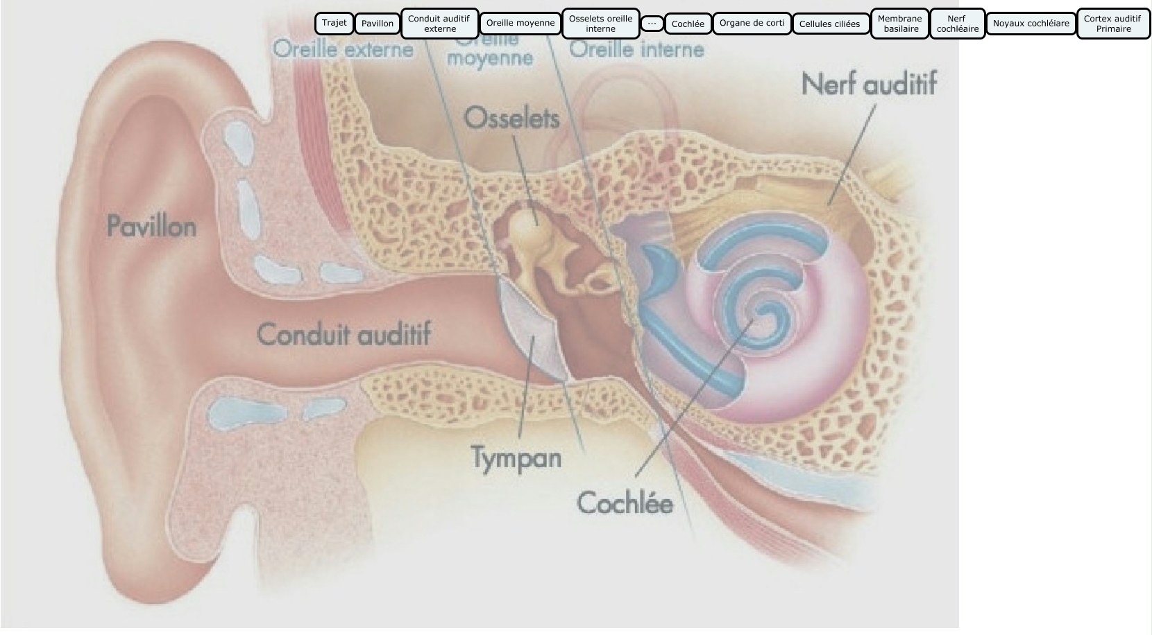 Cette carte de concepts créée avec IHMC CmapTools traite de: trajet audition, ... Cochlée, Pavillon Conduit auditif externe, Oreille moyenne Osselets oreille interne, Trajet Pavillon, Membrane basilaire Nerf cochléaire, Osselets oreille interne ..., Nerf cochléaire Noyaux cochléiare, Organe de corti Cellules ciliées, Cochlée Organe de corti, Conduit auditif externe Oreille moyenne, Noyaux cochléiare Cortex auditif Primaire, Cellules ciliées Membrane basilaire