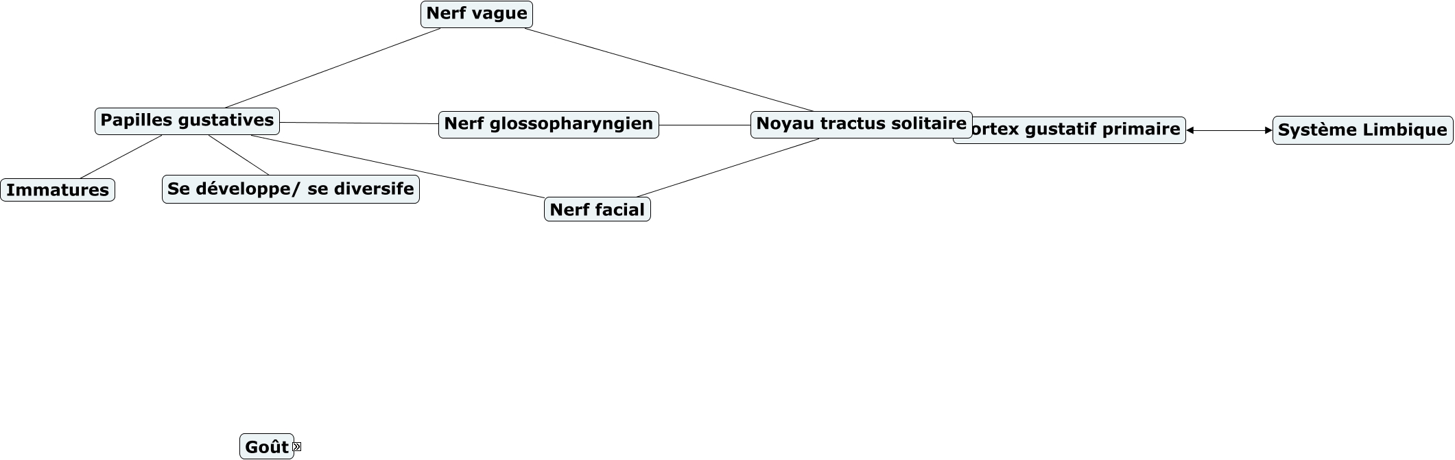 Cette carte de concepts créée avec IHMC CmapTools traite de: Goût, Cortex gustatif Analyse les saveurs, Noyau tractus solitaire Cortex gustatif primaire, Langue connexion Tronc, Nerfs gustatifs Langue, Thalamus connexion Cortex, Goût Noyau au tractus solitaire, Papilles gustatives Se développe/ se diversife, Goût Papilles Gustatives, Papilles gustatives Nerf facial, Noyau au tractus solitaire Transmission rapide, Goût Système limbique, Goût Nerfs gustatifs, Goût Cortex gustatif, Thalamus Transmission effiace, Nerf glossopharyngien Noyau tractus solitaire, Papilles gustatives Immatures, Cortex gustatif primaire Système Limbique, Système limbique Renforcement, Nerfs gustatifs Transmission + rapide, Papilles Gustatives Immatures