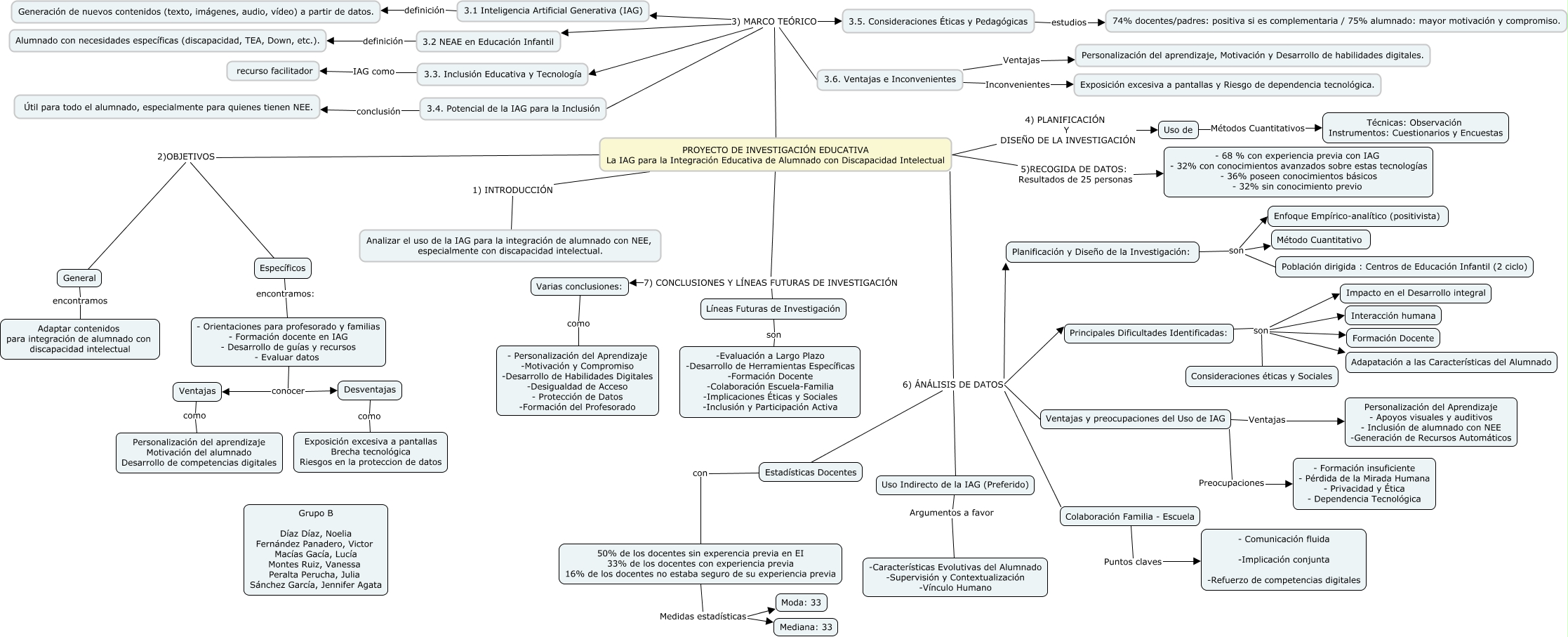 Este Cmap, tiene información relacionada con: Presentación Básica, PROYECTO DE INVESTIGACIÓN EDUCATIVA La IAG para la Integración Educativa de Alumnado con Discapacidad Intelectual 6) ÁNÁLISIS DE DATOS Ventajas y preocupaciones del Uso de IAG, Varias conclusiones: como - Personalización del Aprendizaje -Motivación y Compromiso -Desarrollo de Habilidades Digitales -Desigualdad de Acceso - Protección de Datos -Formación del Profesorado, Uso Indirecto de la IAG (Preferido) Argumentos a favor -Características Evolutivas del Alumnado -Supervisión y Contextualización -Vínculo Humano, PROYECTO DE INVESTIGACIÓN EDUCATIVA La IAG para la Integración Educativa de Alumnado con Discapacidad Intelectual 6) ÁNÁLISIS DE DATOS Uso Indirecto de la IAG (Preferido), 50% de los docentes sin experencia previa en EI 33% de los docentes con experiencia previa 16% de los docentes no estaba seguro de su experiencia previa Medidas estadísticas Mediana: 33, PROYECTO DE INVESTIGACIÓN EDUCATIVA La IAG para la Integración Educativa de Alumnado con Discapacidad Intelectual 6) ÁNÁLISIS DE DATOS Estadísticas Docentes, PROYECTO DE INVESTIGACIÓN EDUCATIVA La IAG para la Integración Educativa de Alumnado con Discapacidad Intelectual 3) MARCO TEÓRICO 3.4. Potencial de la IAG para la Inclusión, PROYECTO DE INVESTIGACIÓN EDUCATIVA La IAG para la Integración Educativa de Alumnado con Discapacidad Intelectual 2)OBJETIVOS General, 3.6. Ventajas e Inconvenientes Ventajas Personalización del aprendizaje, Motivación y Desarrollo de habilidades digitales., 3.6. Ventajas e Inconvenientes Inconvenientes Exposición excesiva a pantallas y Riesgo de dependencia tecnológica., Específicos encontramos: - Orientaciones para profesorado y familias - Formación docente en IAG - Desarrollo de guías y recursos - Evaluar datos, Estadísticas Docentes con 50% de los docentes sin experencia previa en EI 33% de los docentes con experiencia previa 16% de los docentes no estaba seguro de su experiencia previa, 3.4. Potencial de la IAG para la Inclusión conclusión Útil para todo el alumnado, especialmente para quienes tienen NEE., PROYECTO DE INVESTIGACIÓN EDUCATIVA La IAG para la Integración Educativa de Alumnado con Discapacidad Intelectual 3) MARCO TEÓRICO 3.3. Inclusión Educativa y Tecnología, Principales Dificultades Identificadas: son Consideraciones éticas y Sociales, - Orientaciones para profesorado y familias - Formación docente en IAG - Desarrollo de guías y recursos - Evaluar datos conocer Ventajas, Planificación y Diseño de la Investigación: son Enfoque Empírico-analítico (positivista), Principales Dificultades Identificadas: son Interacción humana, Principales Dificultades Identificadas: son Adapatación a las Características del Alumnado, 3.5. Consideraciones Éticas y Pedagógicas estudios 74% docentes/padres: positiva si es complementaria / 75% alumnado: mayor motivación y compromiso.