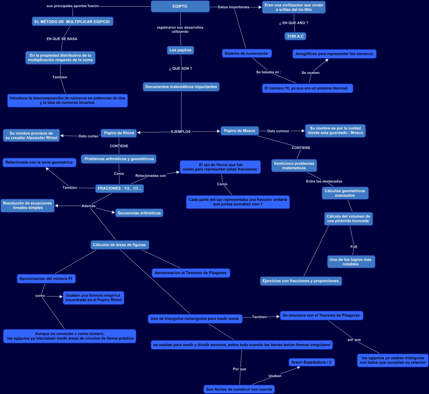 Este Cmap, tiene información relacionada con: Egipto, Uso de triangulos rectangulos para medir areas Tambien Se relaciona con el Teorema de Pitagoras, Los papiros ¿ QUÉ SON ? Documentos matemáticos importantes, El número 10, ya que era un sistema decimal. Se usaban Jeroglíficos para representar los números., En la propiedad distributiva de la multiplicación respecto de la suma Tambien Intruduce la descomposición de números en potencias de dos y la idea de números binarios, EGIPTO Datos importantes Sistema de numeración, Ejercicios con fracciones y proporciones. ???? Cálculo del volumen de una pirámide truncada, El ojo de Horus que fue usado para representar estas fracciones Como Cada parte del ojo representaba una fracción unitaria que juntas sumaban casi 1, Eran una civilizacion que vivian a orillas del rio Nilo ¿ EN QUE AÑO ? 3100 A.C, FRACIONES : 1/2 , 1/3 .. Además Secuencias aritméticas, EL MÉTODO DE MULTIPLICAR EGIPCIO EN QUE SE BASA En la propiedad distributiva de la multiplicación respecto de la suma, FRACIONES : 1/2 , 1/3 .. Tambien Relacionada con la serie geometrica, EGIPTO Datos importantes Eran una civilizacion que vivian a orillas del rio Nilo, Son fáciles de construir con cuerda Usaban Area= BaseXaltura / 2, Cálculos de áreas de figuras ???? Aproximacion al Teorema de Pitagoras, Sistema de numeración Se basaba en : El número 10, ya que era un sistema decimal., Uso de triangulos rectangulos para medir areas ???? se usaban para medir y dividir terrenos, sobre todo cuando las tierras tenían formas irregulares, se usaban para medir y dividir terrenos, sobre todo cuando las tierras tenían formas irregulares Por que Son fáciles de construir con cuerda, Aproximacion del número PI como Aunque no conocían π como número, los egipcios ya intentaban medir áreas de círculos de forma práctica, Documentos matemáticos importantes EJEMPLOS Papiro de Moscú, Cálculo del volumen de una pirámide truncada FUE Uno de los logros mas notables