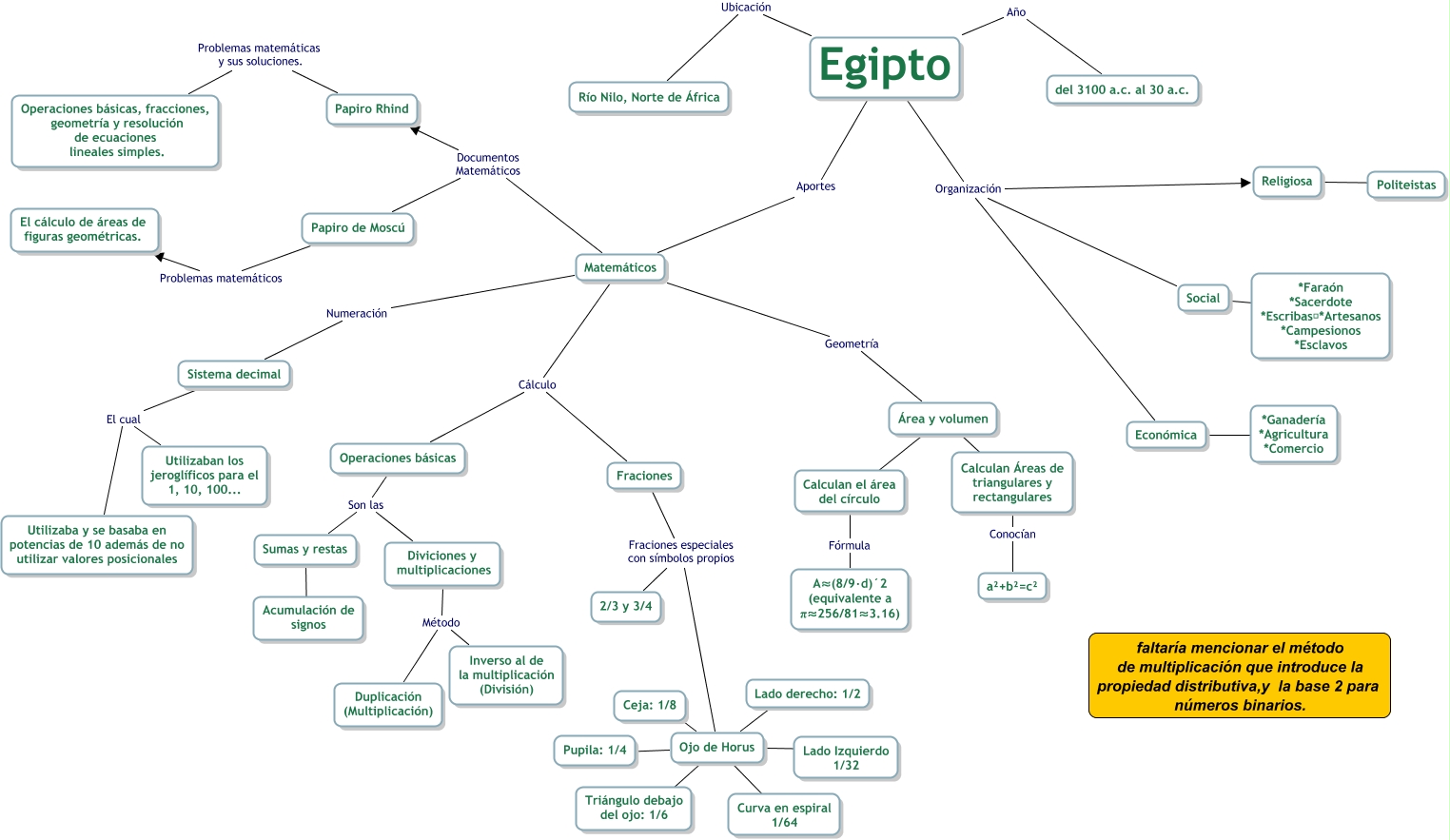 This Concept Map, created with IHMC CmapTools, has information related to: Egipto, Área y volumen ???? Calculan Áreas de triangulares y rectangulares, Matemáticos Geometría Área y volumen, Ojo de Horus ???? Curva en espiral 1/64, Diviciones y multiplicaciones Método Inverso al de la multiplicación (División), Fraciones Fraciones especiales con símbolos propios 2/3 y 3/4, Papiro de Moscú Problemas matemáticos El cálculo de áreas de figuras geométricas., Diviciones y multiplicaciones Método Duplicación (Multiplicación), Económica ???? *Ganadería *Agricultura *Comercio, Área y volumen ???? Calculan el área del círculo, Sumas y restas ???? Acumulación de signos, Papiro Rhind Problemas matemáticas y sus soluciones. Operaciones básicas, fracciones, geometría y resolución de ecuaciones lineales simples., Matemáticos Documentos Matemáticos Papiro Rhind, Ojo de Horus ???? Lado Izquierdo 1/32, Egipto Aportes Matemáticos, Religiosa ???? Politeistas, Egipto Año del 3100 a.c. al 30 a.c., Matemáticos Cálculo Fraciones, Operaciones básicas Son las Diviciones y multiplicaciones, Operaciones básicas Son las Sumas y restas, Ojo de Horus ???? Triángulo debajo del ojo: 1/6