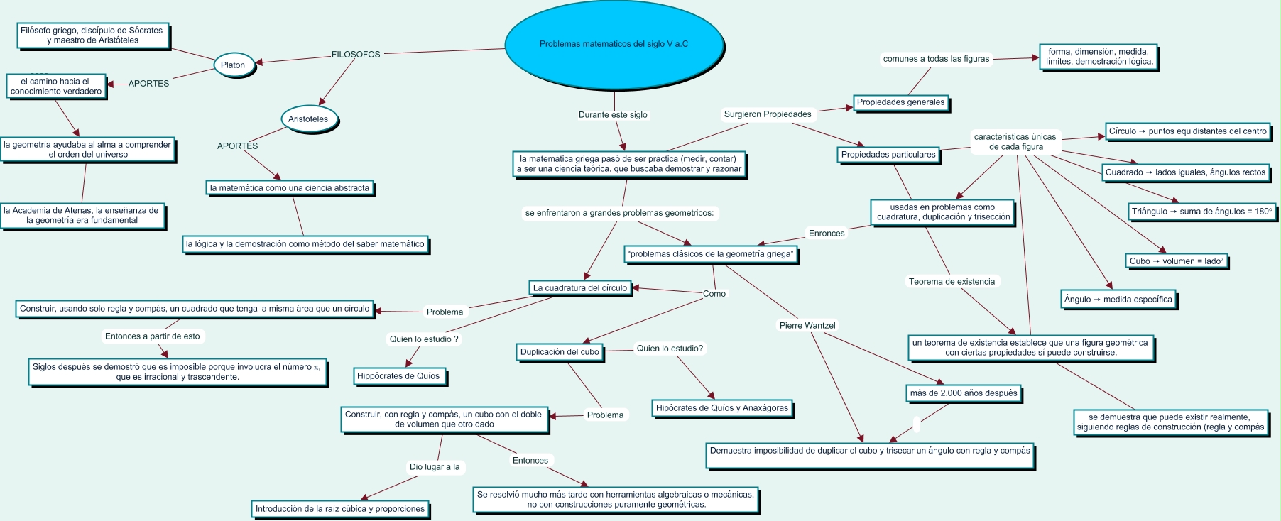 Este Cmap, tiene información relacionada con: SIGLO V, usadas en problemas como cuadratura, duplicación y trisección Enronces “problemas clásicos de la geometría griega”, la matemática griega pasó de ser práctica (medir, contar) a ser una ciencia teórica, que buscaba demostrar y razonar se enfrentaron a grandes problemas geometricos: La cuadratura del círculo, Construir, con regla y compás, un cubo con el doble de volumen que otro dado Entonces Se resolvió mucho más tarde con herramientas algebraicas o mecánicas, no con construcciones puramente geométricas., Propiedades particulares características únicas de cada figura Cuadrado → lados iguales, ángulos rectos, La cuadratura del círculo Quien lo estudio ? Hippócrates de Quíos, Problemas matematicos del siglo V a.C FILOSOFOS Aristoteles, Platon APORTES el camino hacia el conocimiento verdadero, “problemas clásicos de la geometría griega” Pierre Wantzel Demuestra imposibilidad de duplicar el cubo y trisecar un ángulo con regla y compás, más de 2.000 años después Demuestra imposibilidad de duplicar el cubo y trisecar un ángulo con regla y compás, Platon ???? Filósofo griego, discípulo de Sócrates y maestro de Aristóteles, el camino hacia el conocimiento verdadero ???? la geometría ayudaba al alma a comprender el orden del universo, Propiedades particulares Teorema de existencia un teorema de existencia establece que una figura geométrica con ciertas propiedades sí puede construirse., la matemática como una ciencia abstracta ???? la lógica y la demostración como método del saber matemático, un teorema de existencia establece que una figura geométrica con ciertas propiedades sí puede construirse. características únicas de cada figura Ángulo → medida específica, Propiedades particulares características únicas de cada figura usadas en problemas como cuadratura, duplicación y trisección, Propiedades particulares características únicas de cada figura Ángulo → medida específica, un teorema de existencia establece que una figura geométrica con ciertas propiedades sí puede construirse. ???? se demuestra que puede existir realmente, siguiendo reglas de construcción (regla y compás, un teorema de existencia establece que una figura geométrica con ciertas propiedades sí puede construirse. características únicas de cada figura Cubo → volumen = lado³, Propiedades particulares características únicas de cada figura Triángulo → suma de ángulos = 180°, Problemas matematicos del siglo V a.C FILOSOFOS Platon