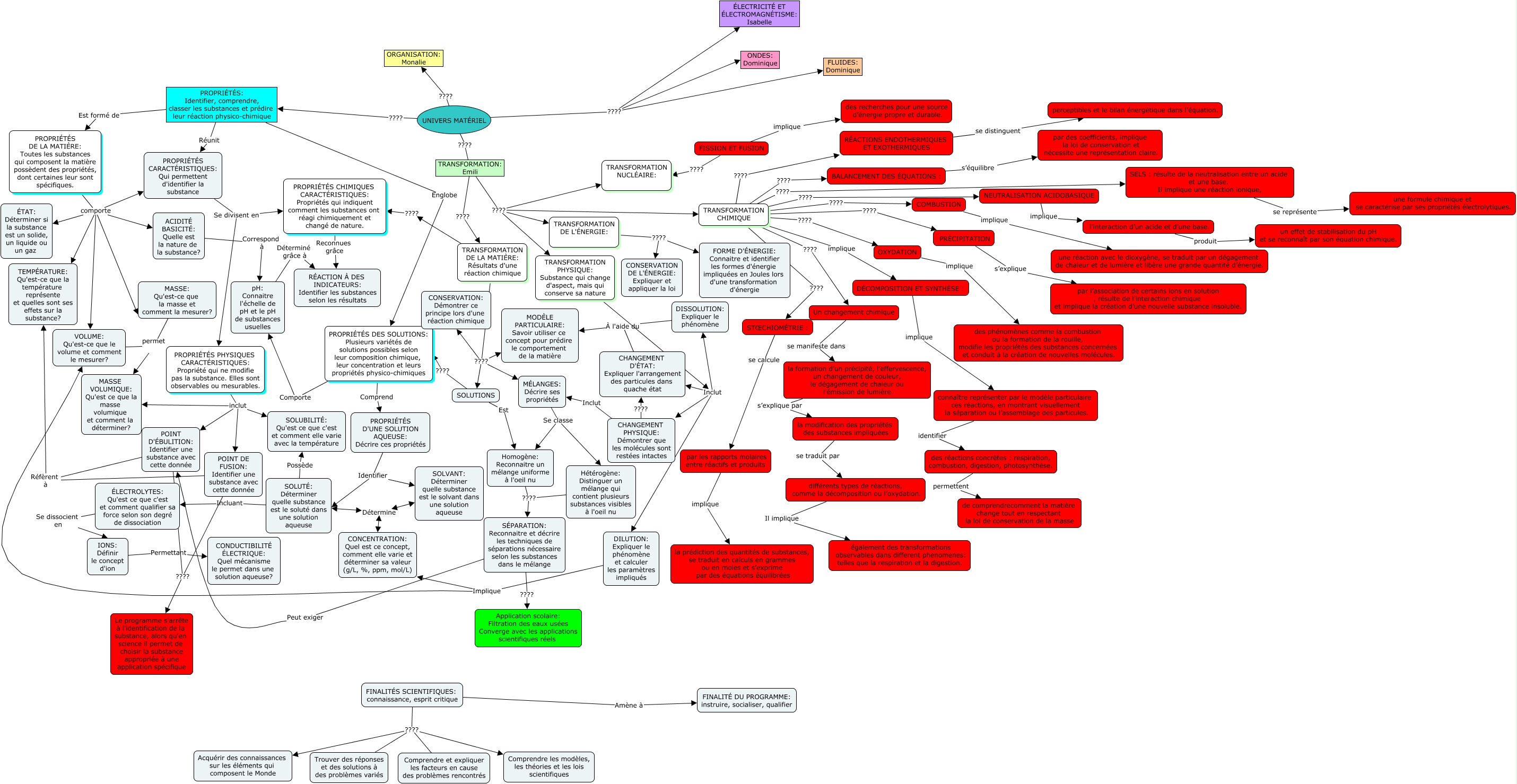 Cette carte de concepts créée avec IHMC CmapTools traite de: Équipe I ne pas modifier par MG sauvegarde, PROPRIÉTÉS DES SOLUTIONS: Plusieurs variétés de solutions possibles selon leur composition chimique, leur concentration et leurs propriétés physico-chimiques Comporte pH: Connaitre l'échelle de pH et le pH de substances usuelles, PROPRIÉTÉS DE LA MATIÈRE: Toutes les substances qui composent la matière possèdent des propriétés, dont certaines leur sont spécifiques. comporte ACIDITÉ BASICITÉ: Quelle est la nature de la substance?, MÉLANGES: Décrire ses propriétés Se classe Hétérogène: Distinguer un mélange qui contient plusieurs substances visibles à l'oeil nu, TRANSFORMATION CHIMIQUE ???? PRÉCIPITATION, SOLUTIONS ???? PROPRIÉTÉS DES SOLUTIONS: Plusieurs variétés de solutions possibles selon leur composition chimique, leur concentration et leurs propriétés physico-chimiques, COMBUSTION implique une réaction avec le dioxygène, se traduit par un dégagement de chaleur et de lumière et libère une grande quantité d’énergie., l’interaction d’un acide et d’une base. produit un effet de stabilisation du pH et se reconnaît par son équation chimique., SELS : résulte de la neutralisation entre un acide et une base. Il implique une réaction ionique, se représente une formule chimique et se caractérise par ses propriétés électrolytiques., TRANSFORMATION: Emili ???? TRANSFORMATION DE LA MATIÈRE: Résultats d'une réaction chimique, TRANSFORMATION PHYSIQUE: Substance qui change d'aspect, mais qui conserve sa nature Inclut CHANGEMENT PHYSIQUE: Démontrer que les molécules sont restées intactes, FINALITÉS SCIENTIFIQUES: connaissance, esprit critique Amène à FINALITÉ DU PROGRAMME: instruire, socialiser, qualifier, UNIVERS MATÉRIEL ???? ORGANISATION: Monalie, Hétérogène: Distinguer un mélange qui contient plusieurs substances visibles à l'oeil nu ???? SÉPARATION: Reconnaitre et décrire les techniques de séparations nécessaire selon les substances dans le mélange, TRANSFORMATION PHYSIQUE: Substance qui change d'aspect, mais qui conserve sa nature Inclut DILUTION: Expliquer le phénomène et calculer les paramètres impliqués, CHANGEMENT D'ÉTAT: Expliquer l'arrangement des particules dans quache état À l'aide du MODÈLE PARTICULAIRE: Savoir utiliser ce concept pour prédire le comportement de la matière, Un changement chimique se manifeste dans la formation d’un précipité, l’effervescence, un changement de couleur, le dégagement de chaleur ou l’émission de lumière., différents types de réactions, comme la décomposition ou l’oxydation. Il implique également des transformations observables dans different phenomenes: telles que la respiration et la digestion., FISSION ET FUSION ???? TRANSFORMATION NUCLÉAIRE:, DISSOLUTION: Expliquer le phénomène À l'aide du MODÈLE PARTICULAIRE: Savoir utiliser ce concept pour prédire le comportement de la matière, UNIVERS MATÉRIEL ???? ÉLECTRICITÉ ET ÉLECTROMAGNÉTISME: Isabelle
