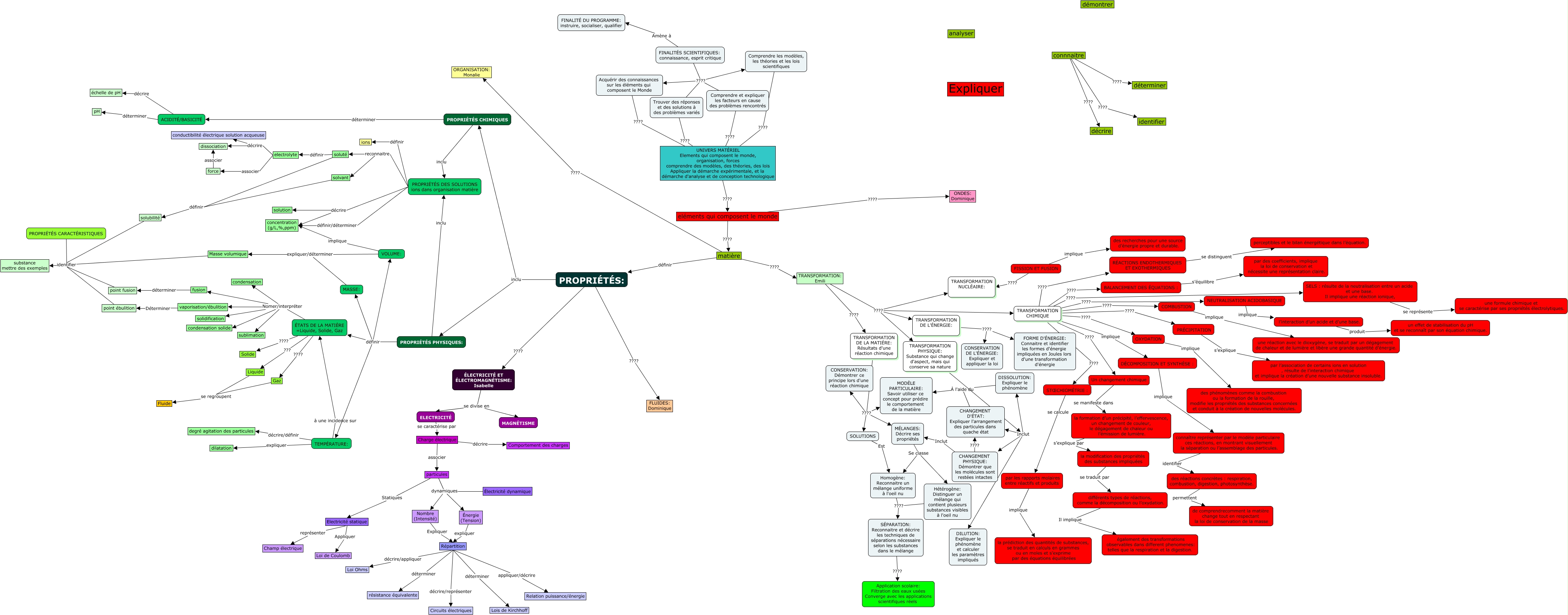Cette carte de concepts créée avec IHMC CmapTools traite de: Équipe I ne pas modifier Isabelle Guisle sauvegarde, Electricité statique représenter Champ électrique, Répartition déterminer Lois de Kirchhoff, Homogène: Reconnaitre un mélange uniforme à l'oeil nu ???? SÉPARATION: Reconnaitre et décrire les techniques de séparations nécessaire selon les substances dans le mélange, Répartition déterminer résistance équivalente, ÉTATS DE LA MATIÈRE =Liquide, Solide, Gaz ???? Solide, connnaitre ???? identifier, PROPRIÉTÉS DES SOLUTIONS ions dans organisation matière définir/déterminer concentration (g/L,%,ppm), TEMPÉRATURE: expliquer dilatation, DISSOLUTION: Expliquer le phénomène À l'aide du MODÈLE PARTICULAIRE: Savoir utiliser ce concept pour prédire le comportement de la matière, solvant définir solubilité, SELS : résulte de la neutralisation entre un acide et une base. Il implique une réaction ionique, se représente une formule chimique et se caractérise par ses propriétés électrolytiques., ACIDITÉ/BASICITÉ déterminer pH, PROPRIÉTÉS: inclu PROPRIÉTÉS PHYSIQUES:, Masse volumique identifier substance mettre des exemples, PROPRIÉTÉS PHYSIQUES: définir ÉTATS DE LA MATIÈRE =Liquide, Solide, Gaz, PROPRIÉTÉS DES SOLUTIONS ions dans organisation matière définir ions, Répartition décrire/représenter Circuits électriques, des réactions concrètes : respiration, combustion, digestion, photosynthèse. permettent de comprendrecomment la matière change tout en respectant la loi de conservation de la masse, particules Statiques Electricité statique, PROPRIÉTÉS: ???? ÉLECTRICITÉ ET ÉLECTROMAGNÉTISME: Isabelle